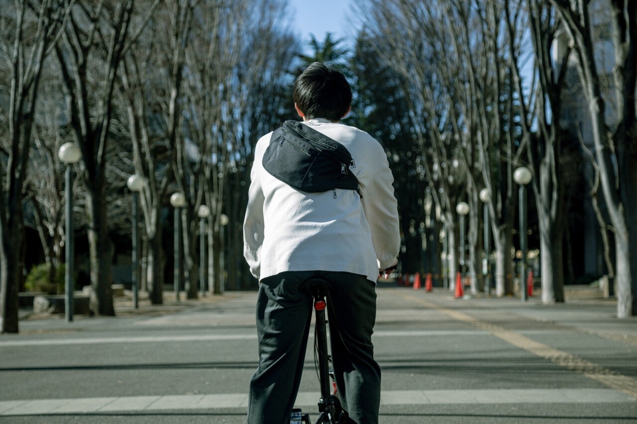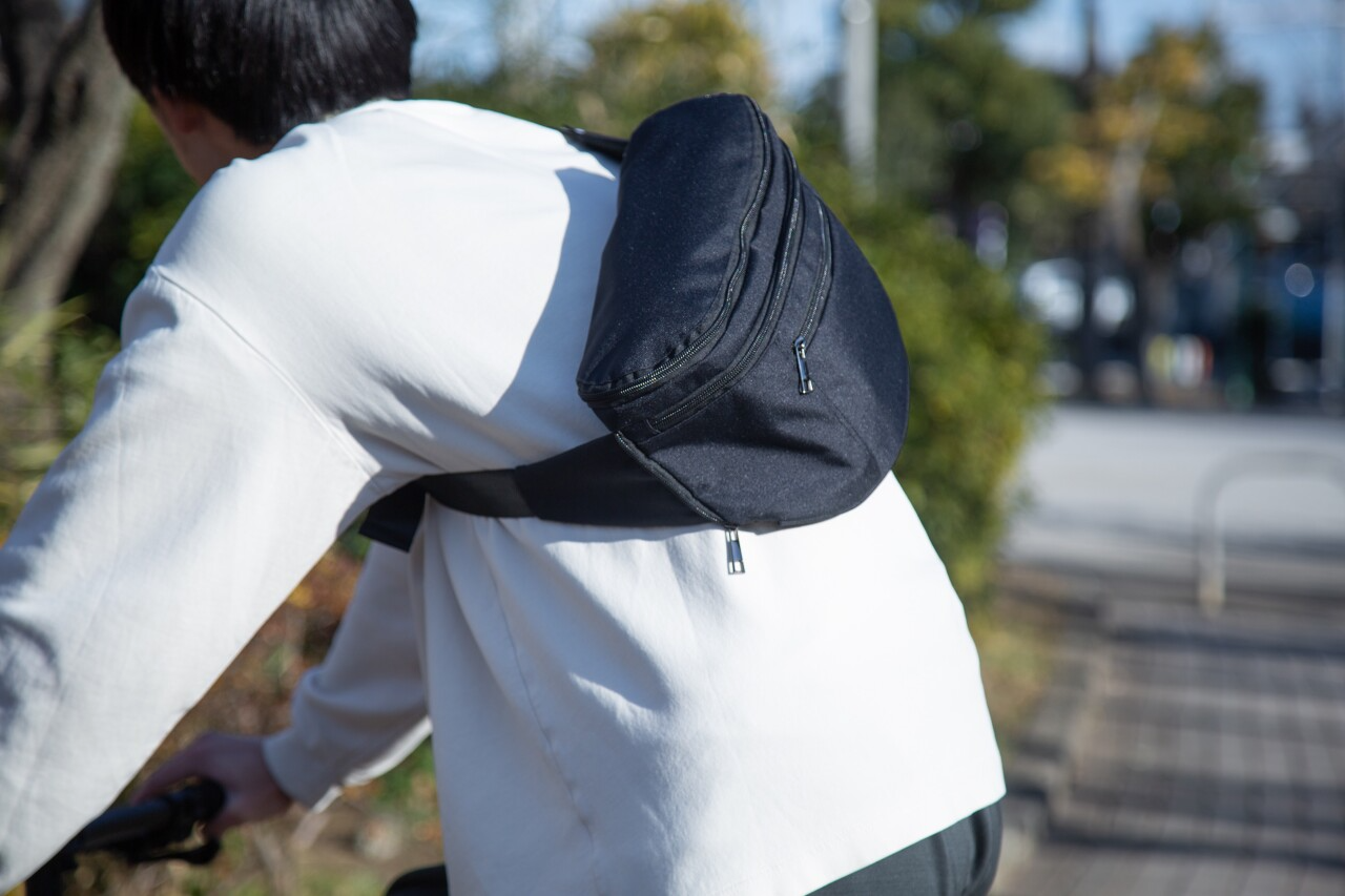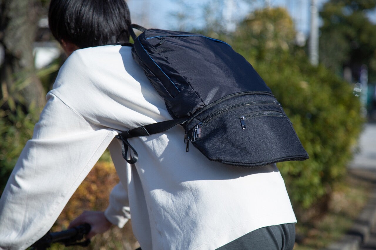 荷物が増えた時はボディバッグからバックパックになるので、左右バランスよく支えられることにより負担が軽減されます。 両手も空いたままなので、自転車での移動もスムーズ。