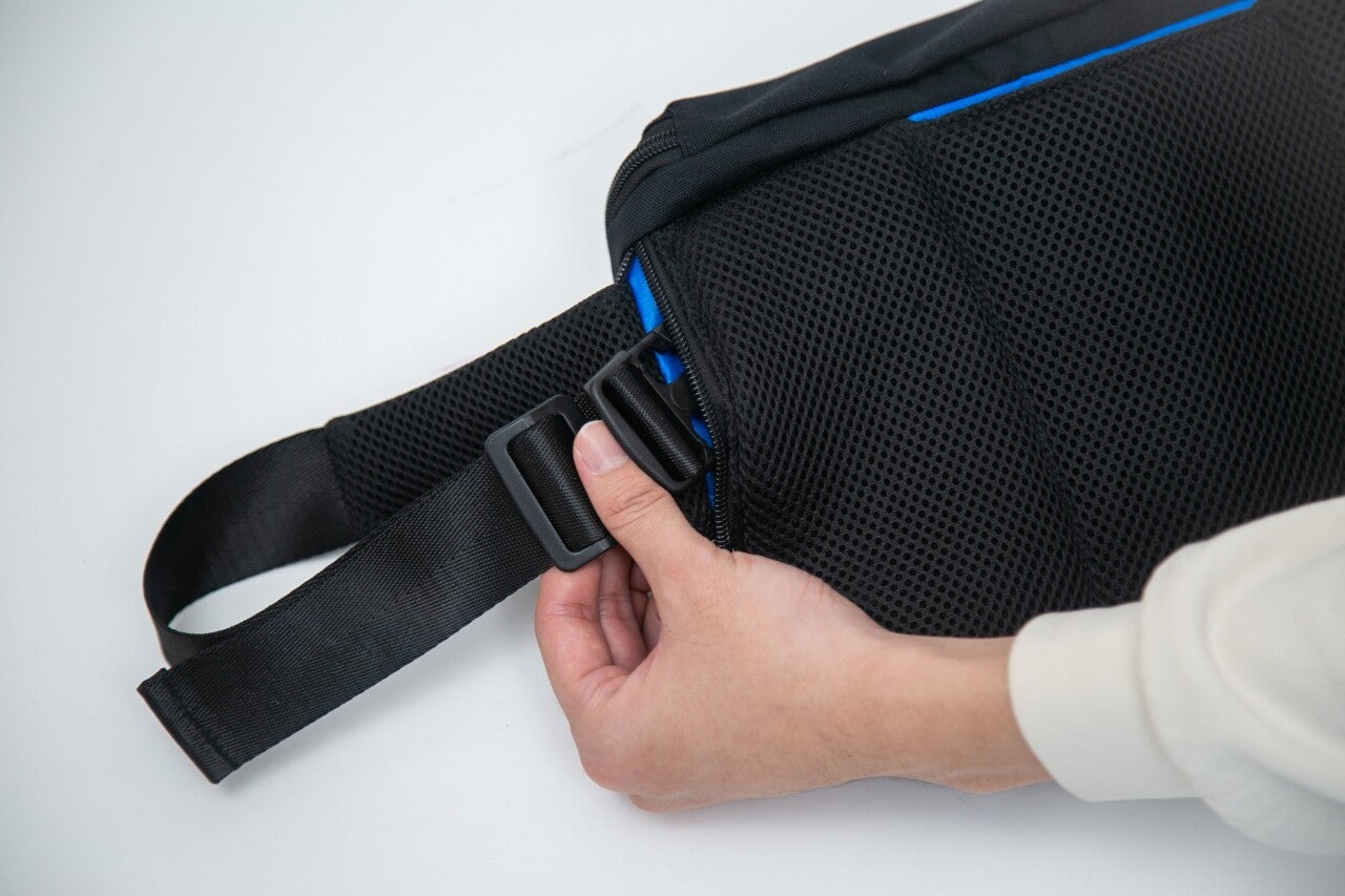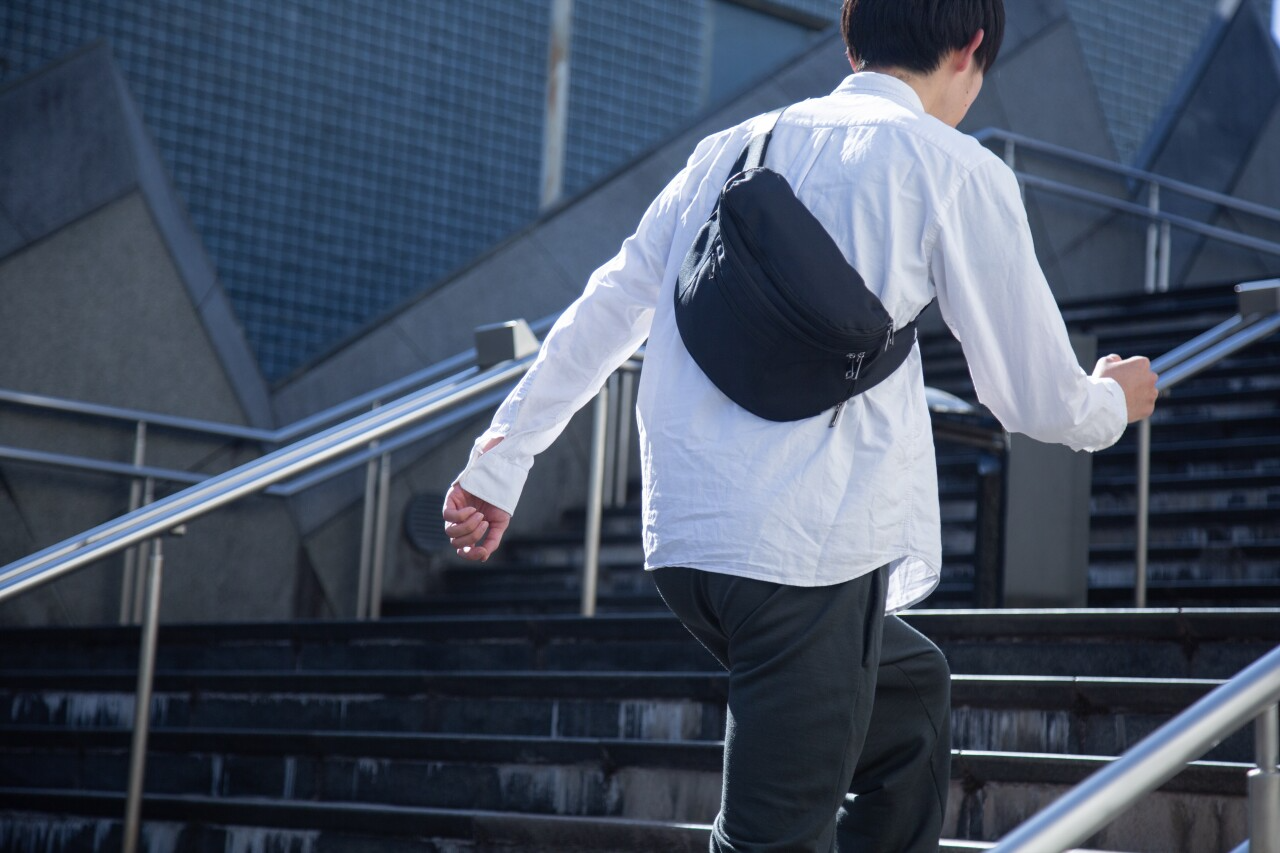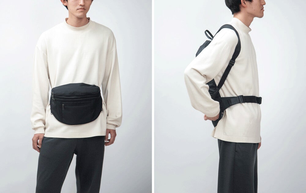 さらに荷物が重たいときは、ボディバッグのベルト部分を腰につけることで、登山リュックのようになり負担が軽減されます。