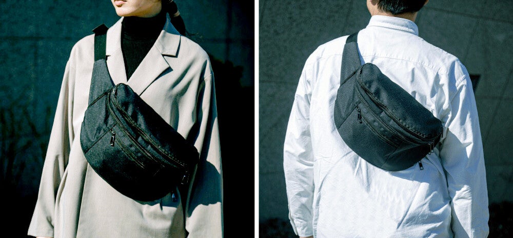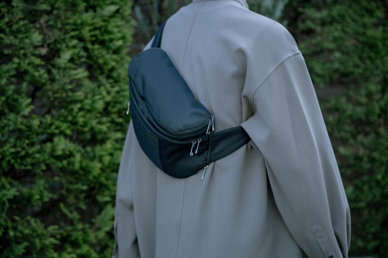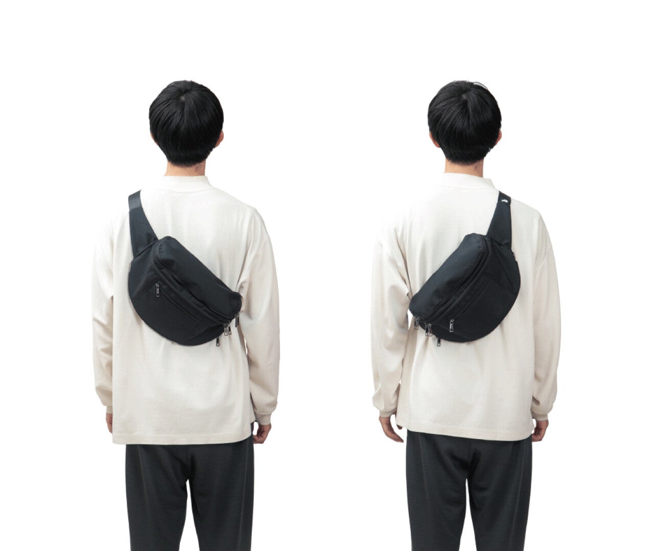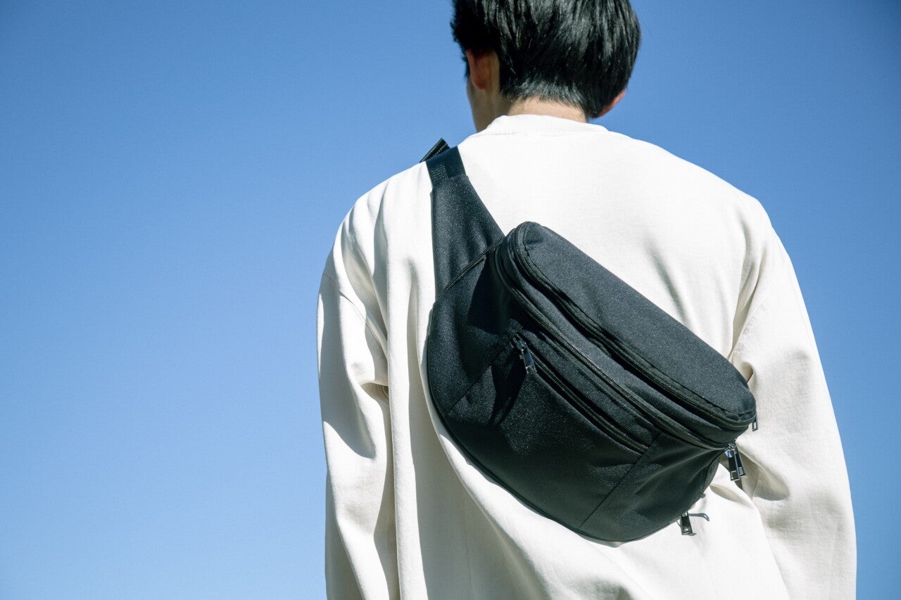 背中にフィットすることを考えた大きめ設計のボディバッグ。
