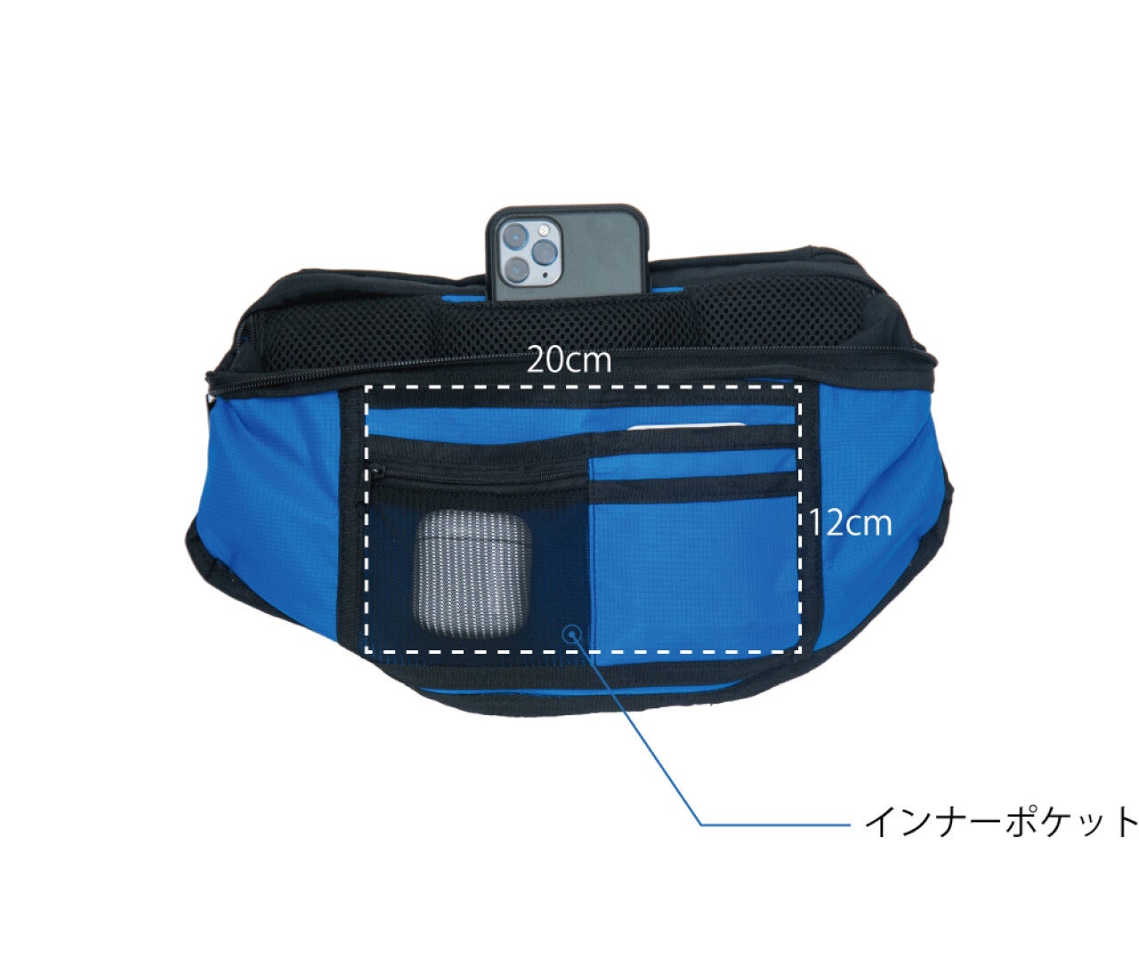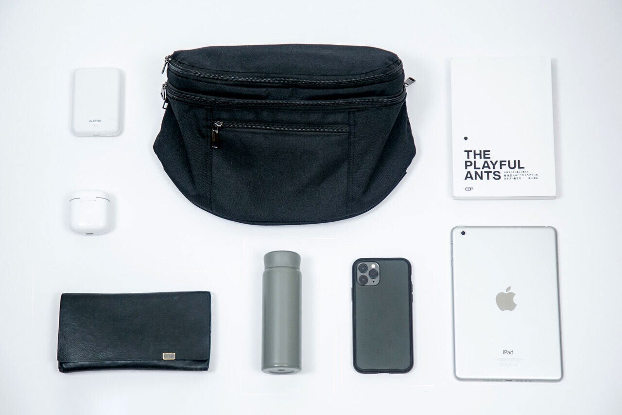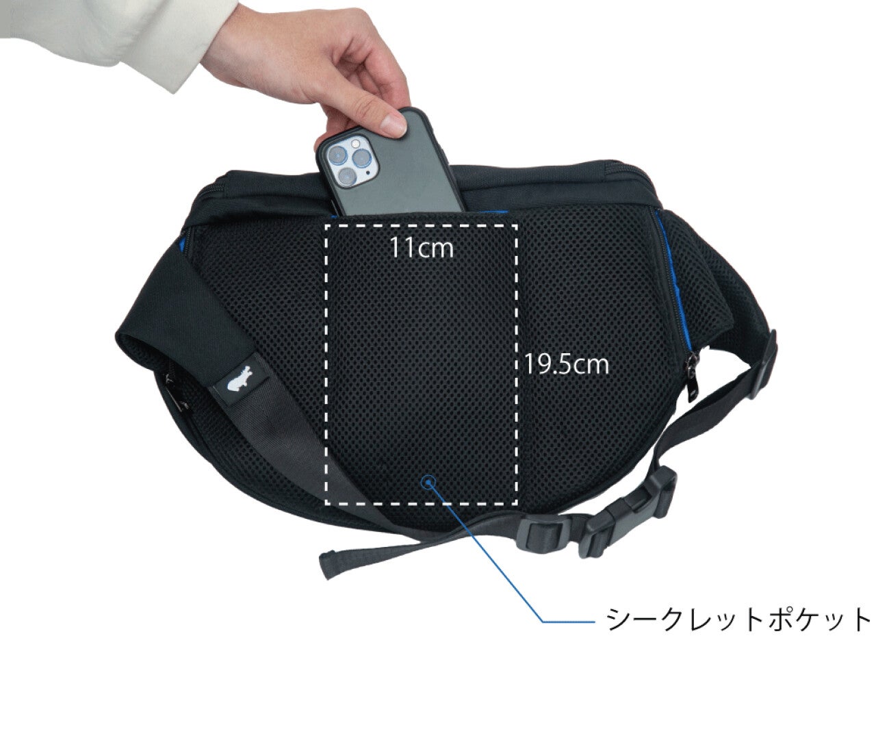 背中にフィットすることを考えた大きめ設計のボディバッグ。