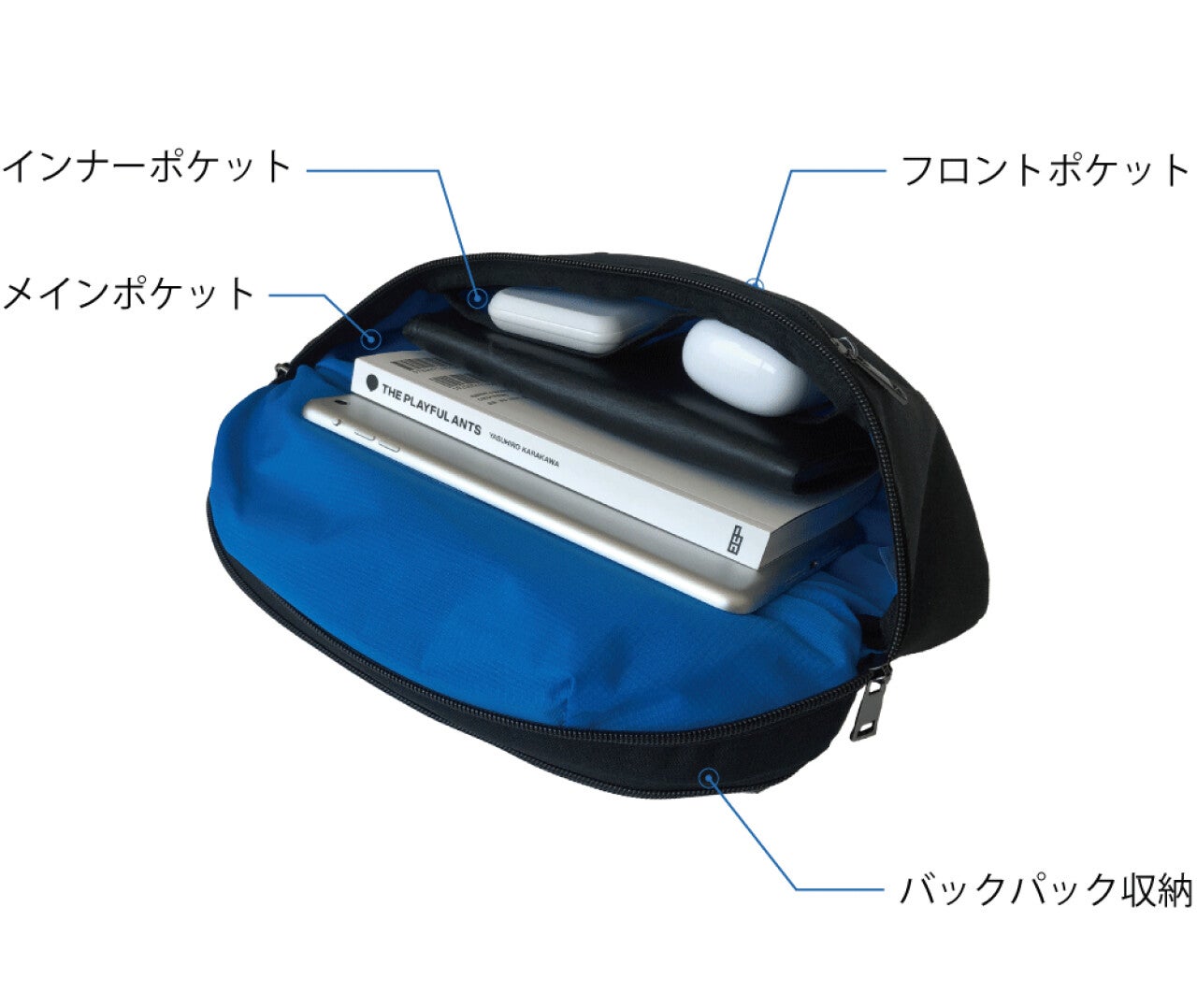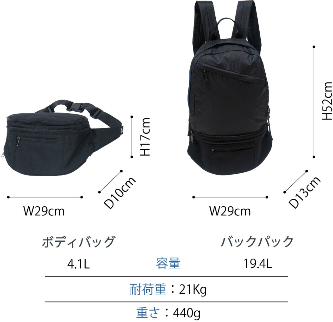 ボディバッグの容量に加えて、バックパックには+15.3L分たっぷり収納できます。