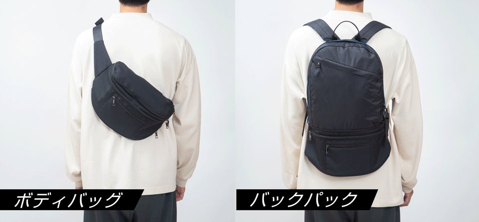 ファスナーを開いて拡げれば、あっという間にボディバッグからバックパックへ。 行きから帰りまで荷物が増えてもずっと手ぶらで出かけられます。 戻す時はくるくると適当に畳めばOK。
