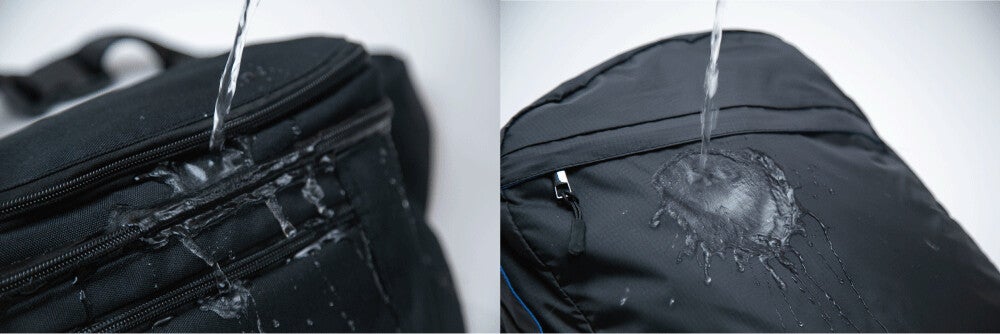 ボディバッグ/バックパックどちらも撥水性があるので、小雨程度の水であればはじいてくれます。