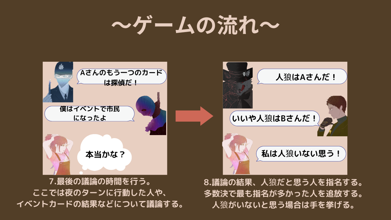 人狼ゲームをプレイしたことがある人なら感じると思いますが人狼ゲームは占い師の力が強く、占い師中心に話が進みます。議論も基本的に占い師の占い結果から流れが始まります。しかし「人狼タクティクス」では1人1人の表と裏のカードが議論の手がかりであり、占い師の結果と同様に1人1人の主張も重要視されます。後半にいくにつれて主張の食い違いを見つけ出すためにも占い師以外の立ち回りも大切なのです。