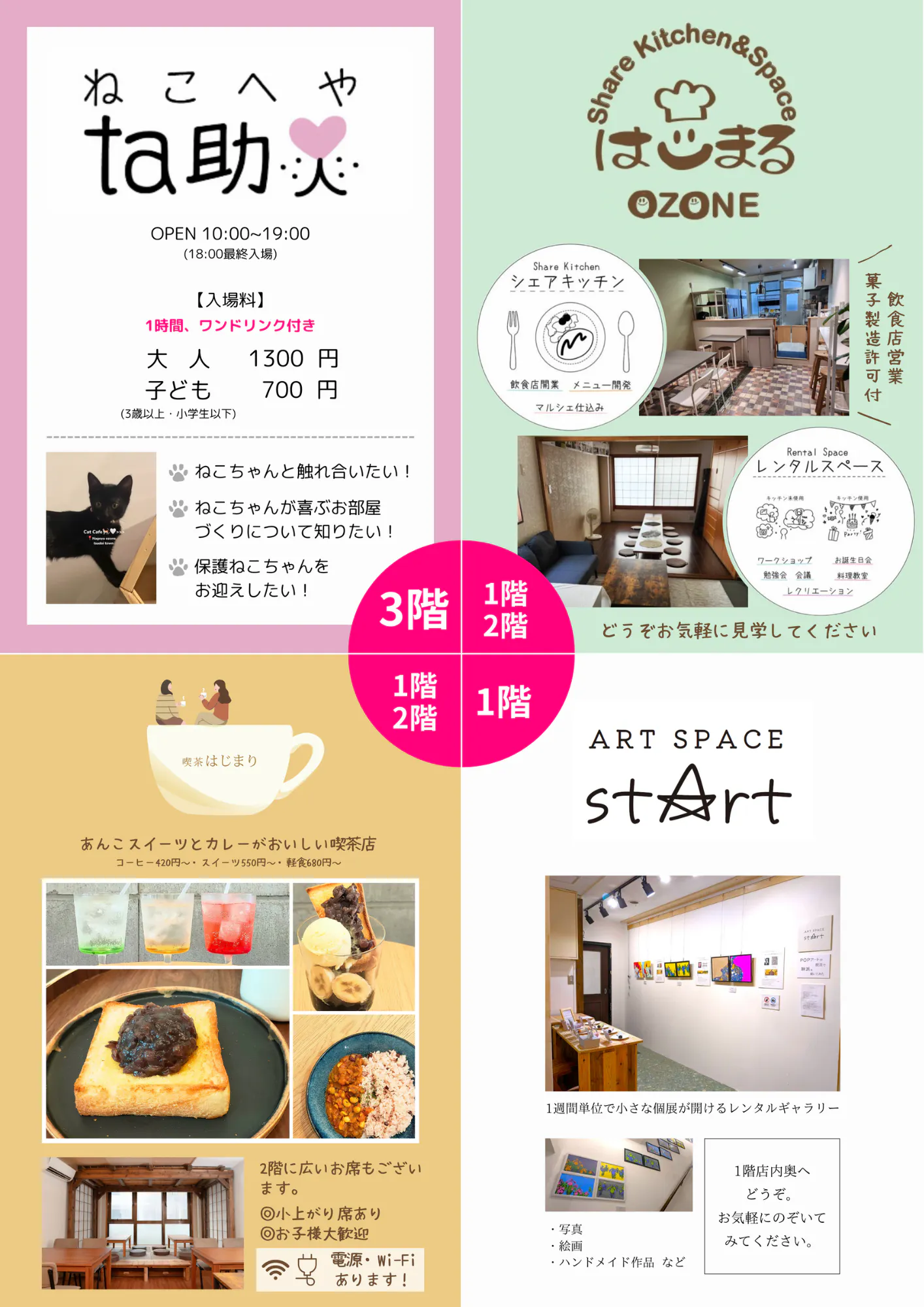 2023/11/29 22:06みなさまお久しぶりです!大曽根商店街 つどいタウンです!8月31日に喫茶はじまりがオープンし、アートスペースstArt(スタート)、シェアキッチン&スペースはじまると、順に通常営業をスタートしておりましたが、ついに、3階のねこへやta助(たすけ)も本格営業が始まりました!!!先月から、地元のお客様には少しずつご入場いただいておりましたが、なかなか新しいお家に慣れない猫ちゃんもいたため、ゆっくりペースでの営業とさせていただいておりました。ようやく、猫ちゃんもスタッフもねこへやta助での生活に慣れ、元気いっぱいに遊べるようになりましたので、改めて「つどいタウン全館グランドオープン」という気持ちでお知らせです!年明けにはつどいタウン全体でのイベントも計画中ですので、皆様ぜひ公式SNS等をチェックしていただけますと幸いです。つどいタウン公式Instagramhttps://www.instagram.com/tsudoitown_ozone/ねこへやta助のInstagram https://www.instagram.com/tasuke_tsudoitown/喫茶はじまりのInstagram https://www.instagram.com/kissa_hajimari/シェアキッチン&スペースはじまるのInstagram https://www.instagram.com/hajimaru_tsudoitaun/アートスペース スタートのInstagram https://www.instagram.com/artspace_start/ もっと見る