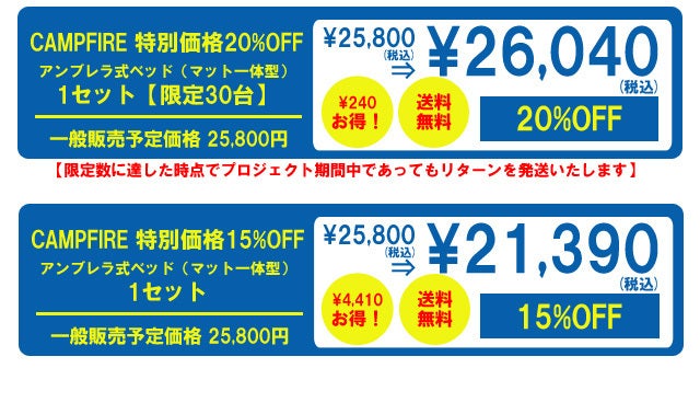 A:アンブレラ式ベッドマット一体型の一般販売につきましては、CAMPFIREからお申込み頂きました方へのリターン納品完了後に実施をする予定にしております。特別価格にてご入手いただけるこの機会に是非ご支援下さい。