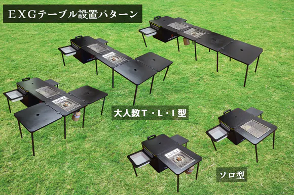 テーブルやコンロの配置は自在に変形OK。ソロキャンプでも、大人数の野外飲み会など、さまざまなシーンで利用できます。