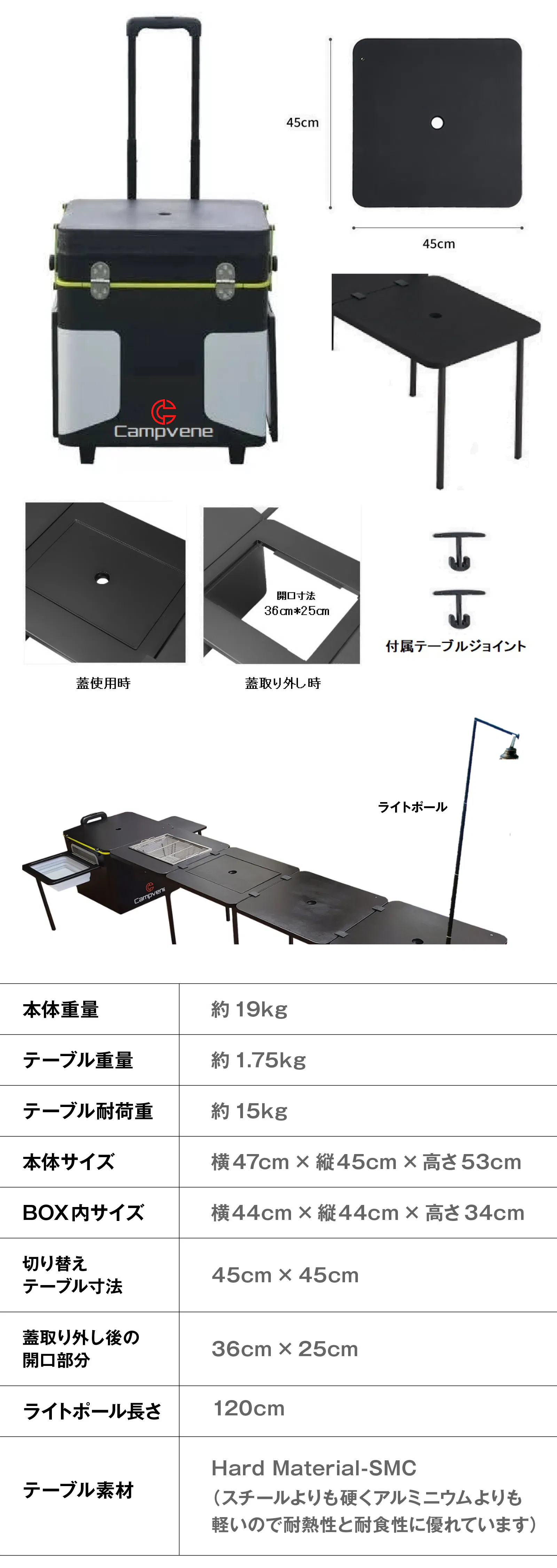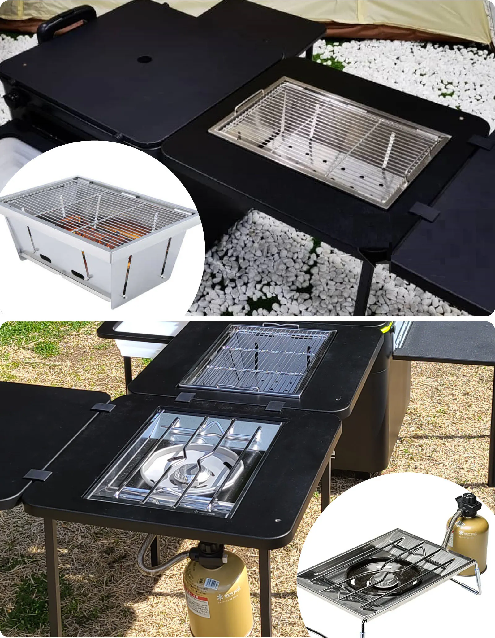 「キャンプやアウトドアでBBQもしてみたいけど用意が面倒」「キャンプでは荷物が多いしテーブルも大きくなるからすべて揃えられない」「キャンプグッズを別々に保管するのは嫌だ」このような理由でワンランク上のキャンプやBBQを諦めていらっしゃる方にも、アウトドアをさらに満喫したいと思っていただけるきっかけとなれば光栄です。