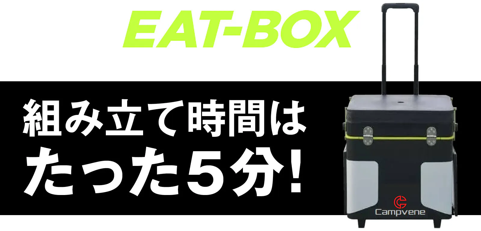 EAT-BOXはテーブルやコンロをコンパクトに収納OK!65Lの大容量でかつ軽量。大量の食材を収納しても、キャスター付きだから、女性でもラクに持ち運び可能です。