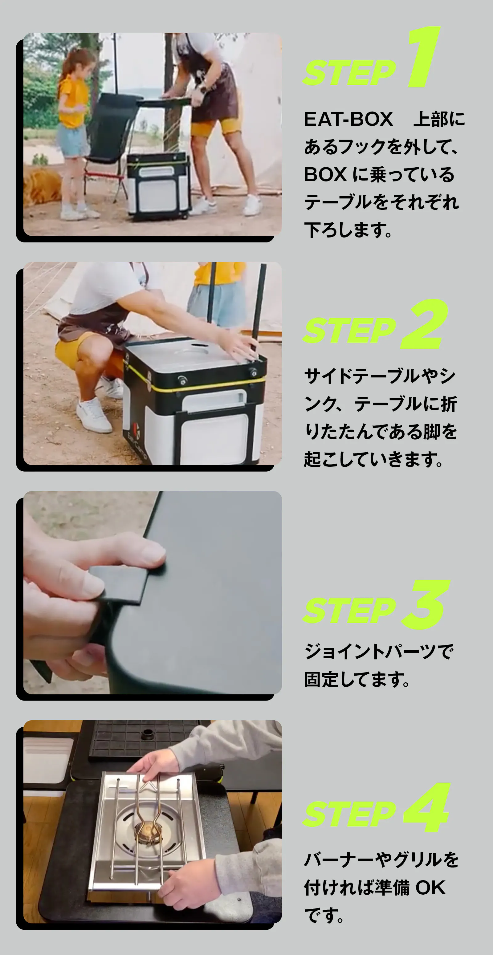 この度は多くのプロジェクトの中から、EXGキャンプテーブルEAT-BOXをご覧いただきありがとうございます。当ブランドのコンセプトは、だれでも気軽に『便利に、楽しく』で、アウトドアの素晴らしく魅力的な体験を多くの方に感じていただくことです。EXGキャンプテーブルEAT-BOXは、デザインも利便性も含めて、キャンプが大好きな方なら誰でも欲しいと思えるキャンプキッチンを目指して製作しました。「キャンプやアウトドアでBBQもしてみたいけど用意が面倒」「キャンプでは荷物が多いしテーブルも大きくなるからすべて揃えられない」「キャンプグッズを別々に保管するのは嫌だ」このような理由でワンランク上のキャンプやBBQを諦めていらっしゃる方にも、アウトドアをさらに満喫したいと思っていただけるきっかけとなれば光栄です。