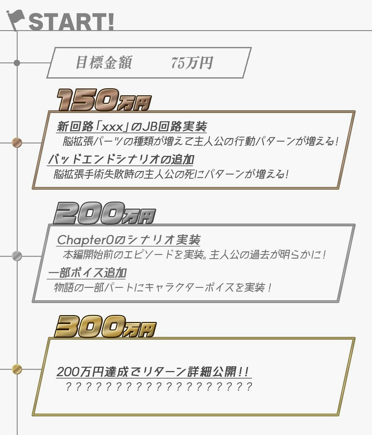追加の資金がなくても開発を進めることは不可能ではありません。ですが正直に言うとその場合は3年後4年後と完成までにかなりの時間がかかってしまいます。また我々が目指す「ハードコアなSF作品を作りたい!」という目標に対し表現的なクオリティが届かない可能性があります。我々はこのゲームを情熱を持って最後まで作り上げる覚悟でいますが、あくまで本業は別にあるため時間が限られているのも事実です。