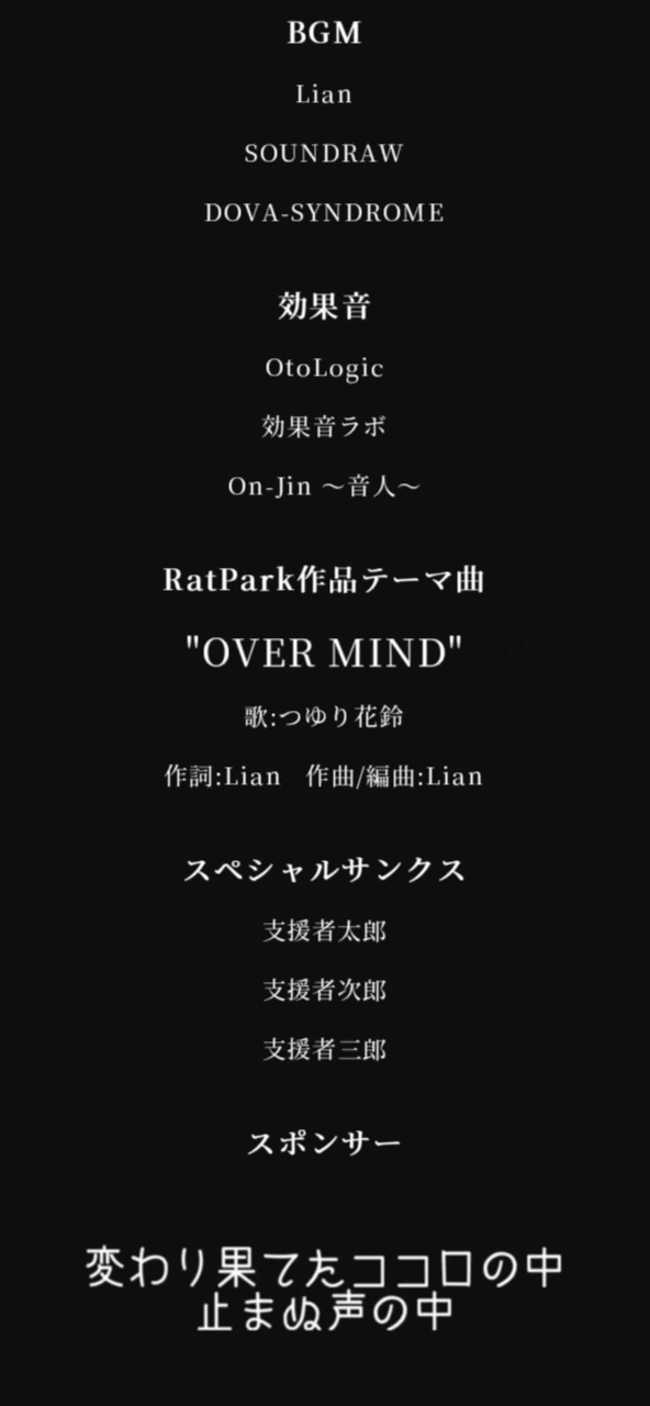 2024/07/24 20:35ご無沙汰しております。RatParkディレクターの胡麻です。記事更新するたび延長とお知らせとなってしまい、誠に申し訳ございませんこの度、RatPark製品版(1章2章)のリリース時期が延期となりました。理由については別の記事で詳しく説明しておりますので、そちらをご確認ください。前回同様グッズの制作状況と開発進捗について不安に思われる方も多いと思うので、今回もRatPark開発の最新状況をあわせてお届けします。スタッフ一同の励みになりますのでご意見やご感想ありましたらCAMPFIREのコメント欄もしくはDiscordの雑談部屋まで投稿いただけますと幸いです。クラファン返礼品の進捗■限定パッケージ&アートブック(進捗100%)■ サウンドトラックCD(進捗100%)■ 地下都市入園チケット(進捗100%)■ 園内マップ制作(進捗100%)■ サイン色紙(進捗100%)■ 設定資料集(進捗100%)■ フィギュア制作(進捗60%)RatPark本編の進捗■2章エンディング楽曲について2章エンディング楽曲が完成しました。完全オリジナル楽曲でタイトル「Anesthesia」です。Youtubeに投稿しましたので是非ご試聴ください。作詞作曲はLian様、ボーカルは椎可様にご依頼しました。物語の舞台が植物園と宗教施設であることから歌詞にもそれらを意識したキーワードが散りばめられています。こちらの楽曲はクラウドファンディングの返礼品であるRatParkオリジナルサウンドトラックvol1にも収録しています。音楽聴き放題サービスでの配信も検討していますので続報をお待ちください。■脳拡張の個別演出について こちらの記事でも触れましたが「脳拡張」のゲーム体験の刷新に取り組んでいます。現状の仕様ですと脳拡張によるゲーム内の変化が選択肢によるシナリオ分岐のみで、ビジュアル面での変化に乏しいし面白みに欠けるという課題に直面しています。課題を解消するために「個別演出の開発」に取り組んでいます。例えば、怒りの感情を高める脳拡張回路をセットしたとき・怒りのボルテージにあわせて画面全体が燃え上がるような見た目に変化する・さらに怒りを爆発させるためのコマンドを押すことができる。ようなゲーム仕様に変更しています。この脳拡張の個別演出は脳拡張回路ごとに演出が異なるもので他にもハッキングで相手を攻撃できるようになる脳拡張回路や、視覚を強化する脳拡張回路などでそれぞれ演出を用意しています。将来的にはすべての脳拡張回路で何かしらの演出を用意したいと考えていますが、直近1章2章のリリースでは作中で使用頻度の多い脳拡張回路「アンガーマネジメント」「ネガフィルム」「ユーモアセンス」「電脳ハッキング」「高倍率補視器」「人工内耳インプラント」の個別演出を制作しております。「へーなんか面白そうじゃん」と思っていただけたら嬉しい限りです。制作チームとしては脳拡張の個別演出の作り込み次第でRatParkのゲーム体験に対する印象が大きく変わると考えています。一方でUIデザイン、サウンド、Unity、シナリオ執筆の作業を並行的に進めなければならず作業量も膨大です。完成までそれなりの時間を要することご理解いただけますと幸いです。以上活動報告でした。最後までお読みいただきありがとうございました。 もっと見る