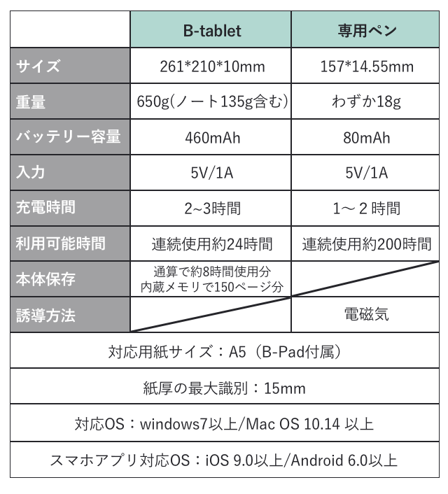 ※"B-Tablet"本体には書いた内容次第ですが、約100~150ページ分の内容を保存可能です。