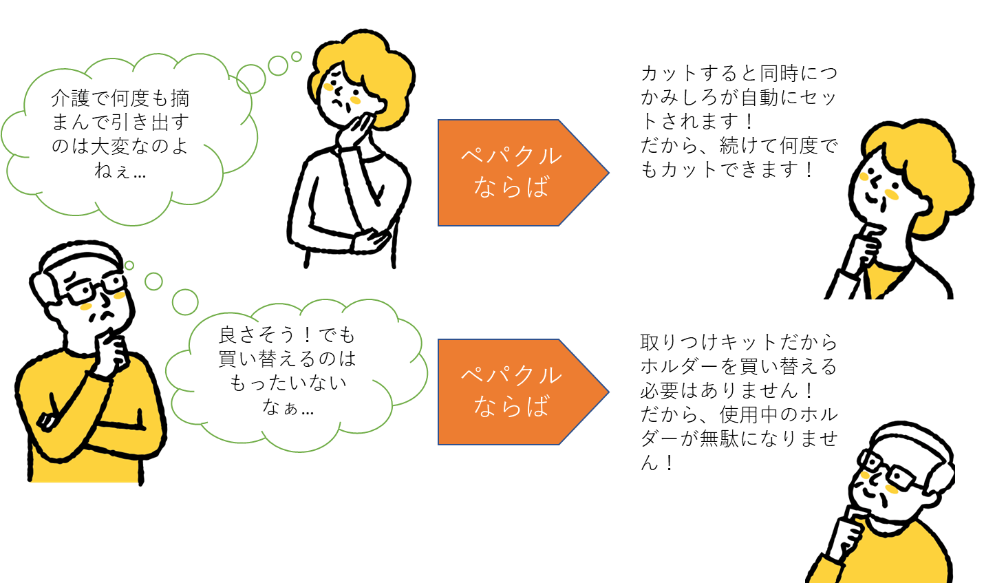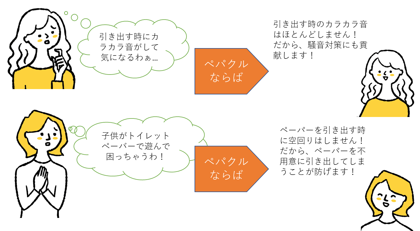 ペパクルを使え ば、簡単にペー パーをつかんで引き出すことができ、ストレスなく快適にトイレを使う事が出来ます。