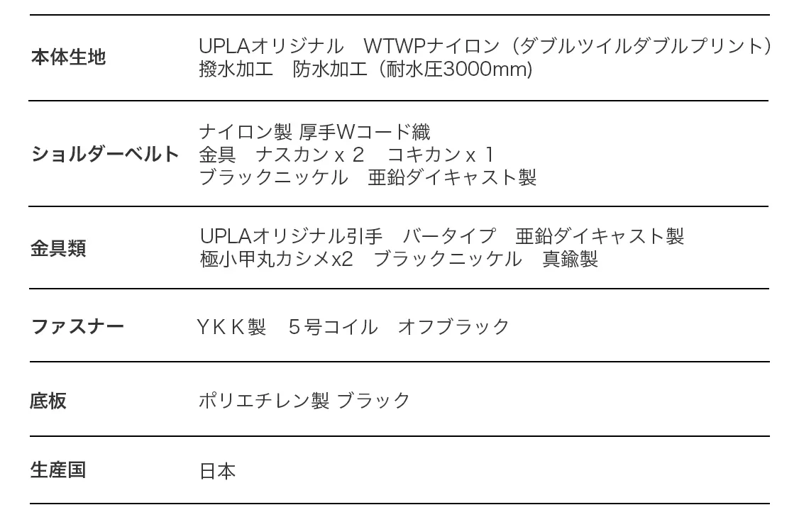 本製品はUPLA独自の特別なナイロン生地を採用し、軽量且つ耐久性に優れた気品のある製品になっています。