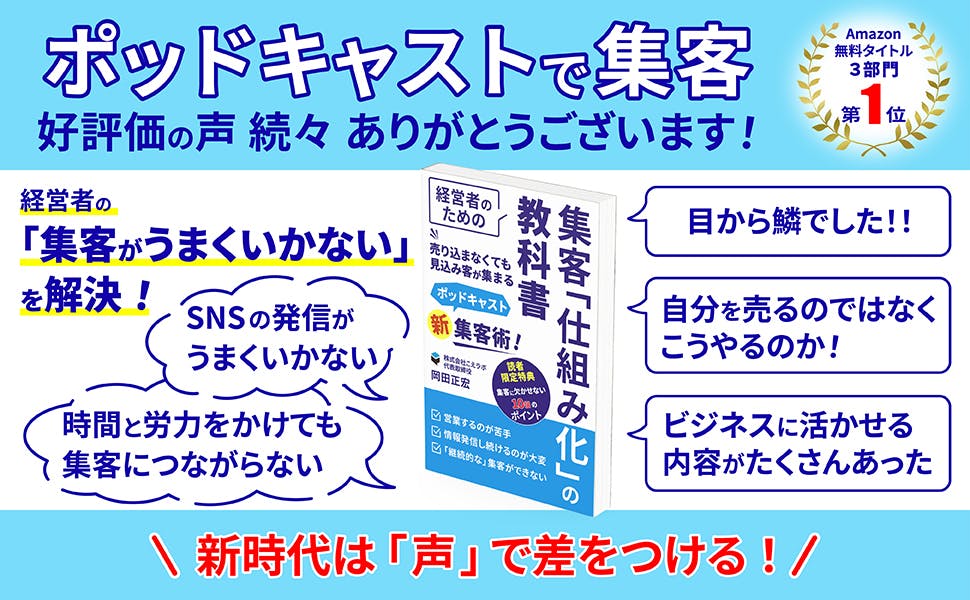 2024/02/17 10:45こんにちは。こえラボの岡田です。クラウドファンディングを実施してから早半年が経過しました。おかげさまでポッドキャストを活用していただく方が増え、現在では250番組の達成を迎えました。私がインタビューする『経営者の志』も、700回の達成が目前です!1年間で224名の方にインタビューし、多くの繋がりを得ることができました。これはポッドキャストを用いた集客の体系化が功を奏した結果だと実感しています。この度、サンクチュアリ出版とのコラボレーションにより、イベントホールでのセミナー開催が決定いたしました。リアルでのセミナーは現在行っておらず、直接お会いできる貴重な機会です。クラウドファンディングで作成した書籍の内容と連動しているセミナーです。~売り込まなくても見込み客が集まる!新集客術~経営者のための集客「仕組み化」の教科書https://amzn.to/3OLgV92ご質問の時間も設けていますので、ぜひご参加ください。 ◆セミナー詳細◆『1年で224名インタビュー達成!音声メディアで見込み顧客獲得「ポッドキャスト」活用講座』日時:2024年2月28日(水)19:30-20:30場所:サンクチュアリ出版 地下1Fイベントホール(東京都文京区向丘2-14-9)詳細・お申し込みはこちらhttps://www.sanctuarybooks.jp/eventblog/index.php?e=3096 お会いできるのを楽しみにしています! もっと見る10/12開催:クラウドファンディング成果報告&活用セミナー