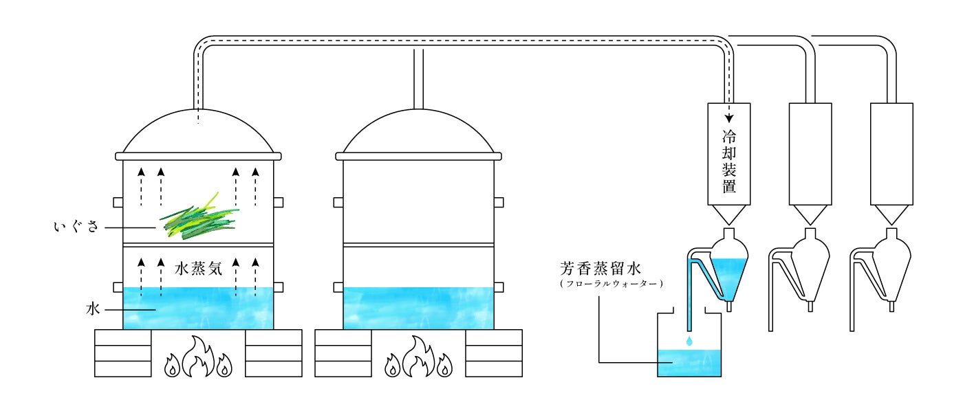 スギやヒノキといった日本古来、住まいに用いられてきた木々の香りというのは、私たちの身体がとても良く覚えていて、懐かしく良い香りがします。この度、南山さんから抽出を依頼された「い草」は精油ではなく芳香水となりますが、日本人が好きな畳のいい香りがするフローラルウォーターが精製出来ております。きっとたくさんの人に気に入って頂けるものと確信しております。