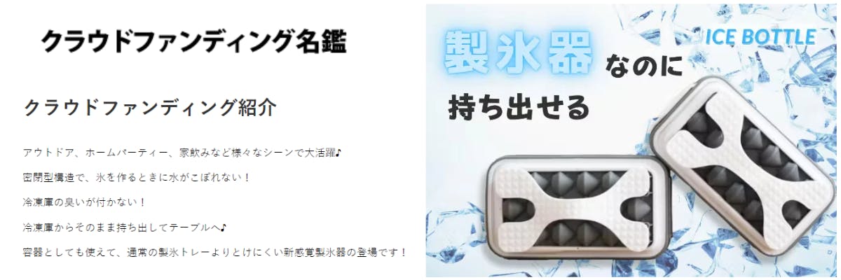 2023/07/10 19:25昨日公開されましたどこでも持ち出せる製氷器「ICE BOTTLE」!なんと、タレント名鑑に掲載されました!https://crowdfunding.meikan.org/project/campfire-676022/ 皆様は暑い毎日、いかがお過ごしでしょうか。これからの季節は「氷」を使う場面がたくさんありますね。本プロジェクトはみなさまの夏のイベントまでに製品が届くよう、お盆前までの配送を予定しております。一日もはやくお手元に商品を届けられるようスタッフ一同尽力いたします。購入をご検討中の方におかれましては、質問も随時受け付けておりますので、いつでもメッセージおまちしております。みなさまのさらなる応援を引き続きよろしくお願いいたします。 もっと見る