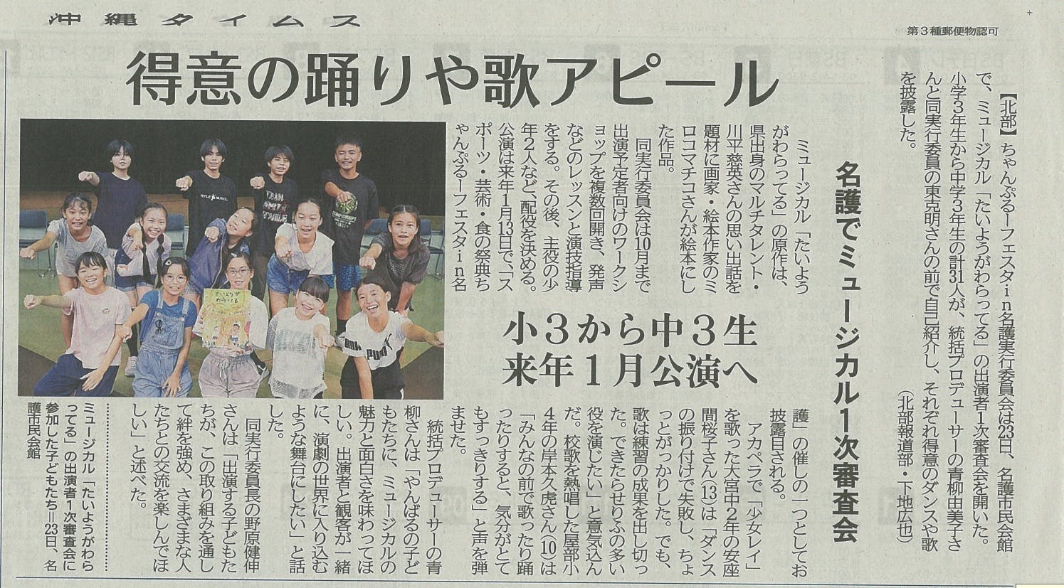 僕には沖縄弁のセリフが難しかったけど、地元のみんなならもっとリアルな芝居ができると思うし、沖縄の空気の中でなら歌もダンスももっともっと楽しくなると思います。演じる経験は、きっと僕みたいに自信がつくと思うし、お客様もみんな笑顔になれると思います。 沖縄の太陽とガジュマルの森の下で「ちゃんぷるフェスタin名護」を成功させて、名護の子どもたちの挑戦を応援しています!