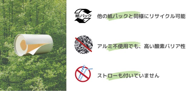 長期保存ができる上に、リサイクル可能な容器で、かつストローも付いていませんので、お飲み頂いたあとは自治体の紙パックリサイクルや、スーパーの紙資源回収ボックスに出していただけます。
