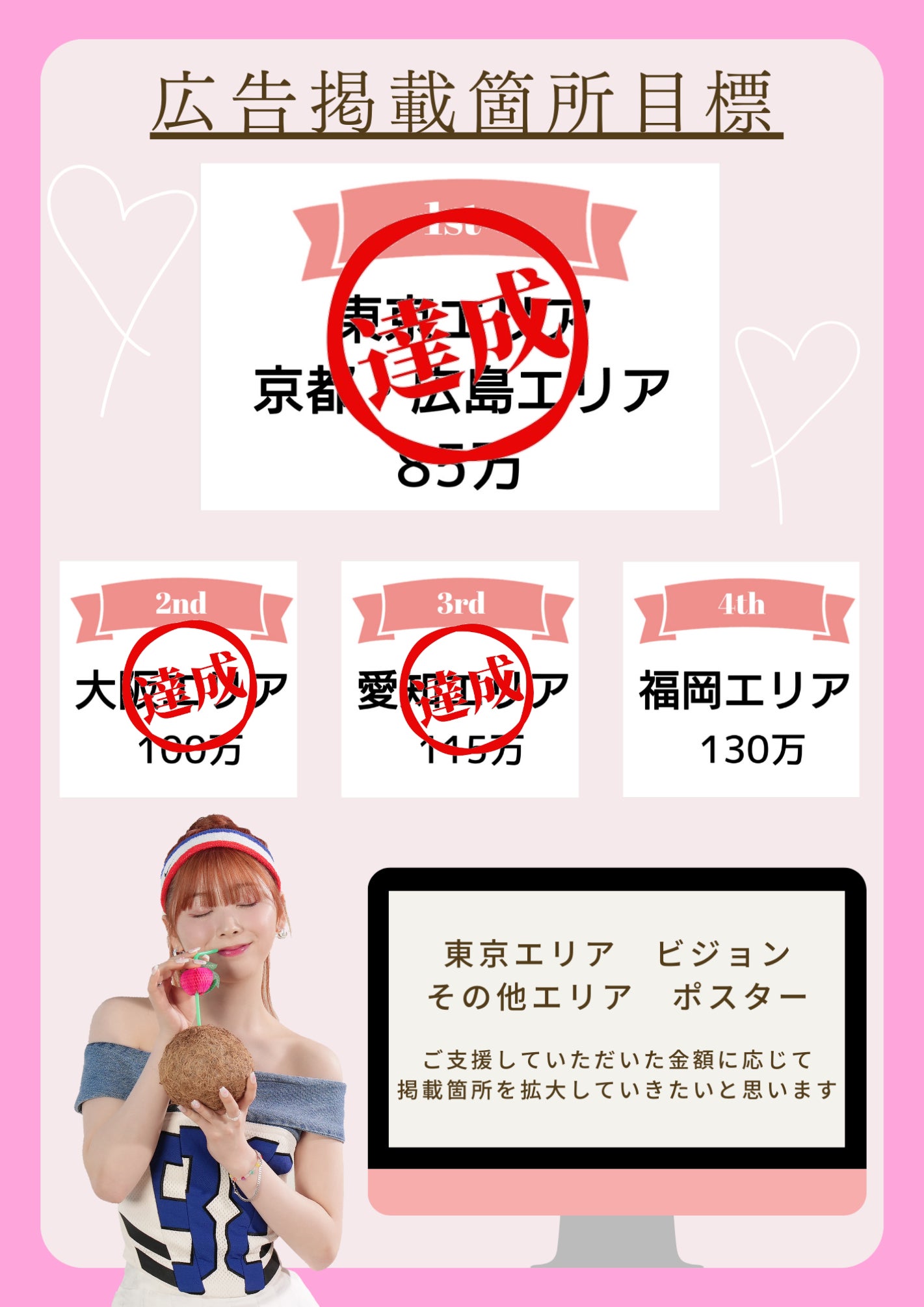 東京エリア、ミイヒちゃんの出身地京都エリア、ツアーで誕生日が近い広島エリア。を目標としてます。多くの金額が集まった際には更なる広告の掲載やSNS広告も検討しています。