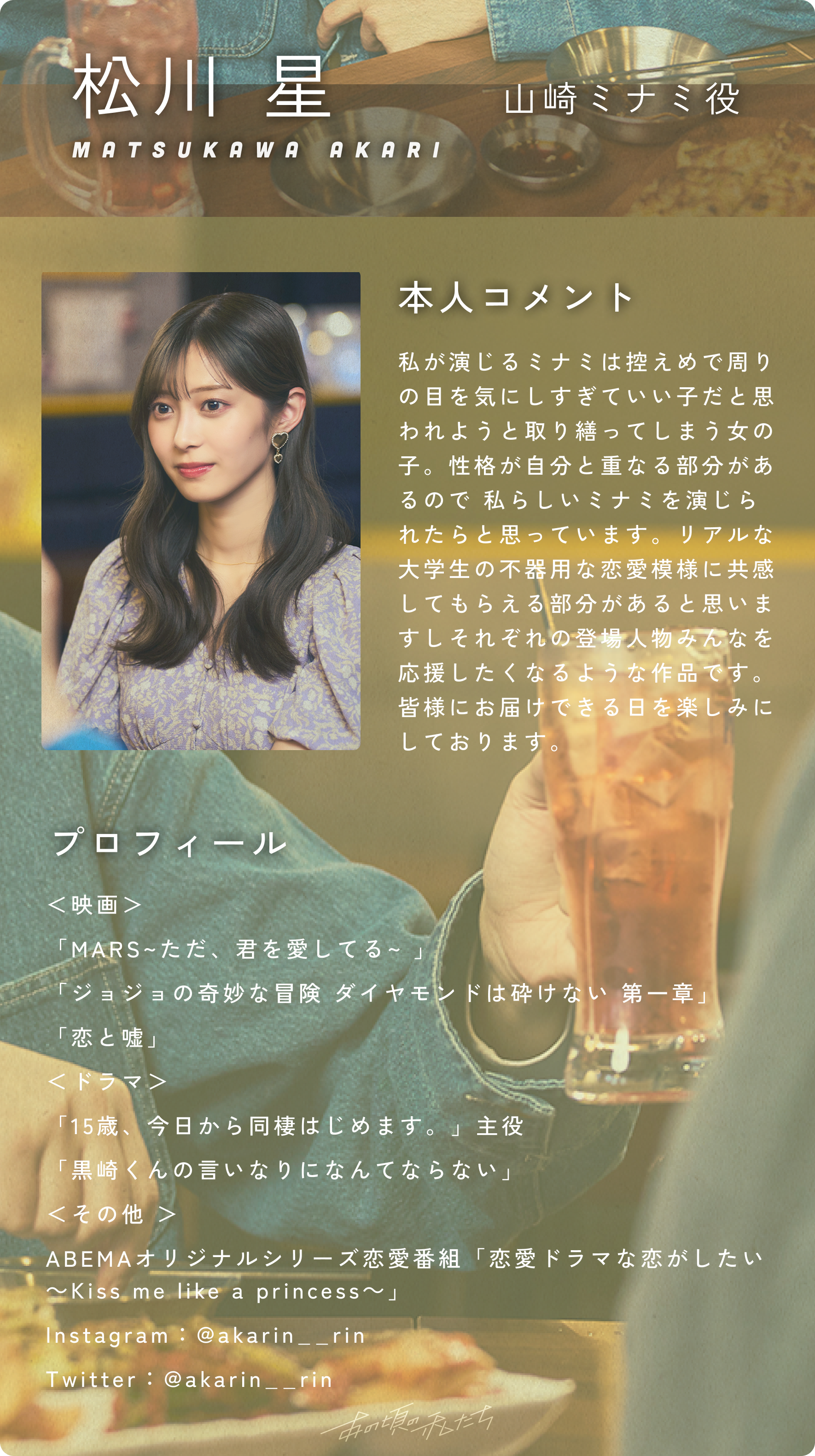 男女グループの中で、恋愛、友情に揺れ動くリアルな大学生を描いた青春ラブストーリー。