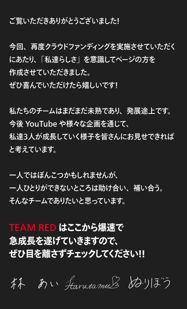 今回このクラウドファンディングを皆さんと一緒に盛り上げていきたいと思っているため、達成額に応じて下記を開催することをお約束いたします!東京以外の遠方にお住まいの方、私達3人が会いに行きます!!