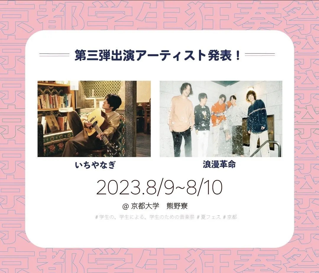 京都大学の音楽サークルを中心に出演してもらいます。軽音サークルからjazzサークル、ブルーグラスサークルや邦楽サークルなどジャンルレスに集めます。また、学生のオリジナルバンドや京都に縁のあるプロのアーティストの方々にも出演していただきます。以下現在出演が確定しているアーティスト一覧になります。