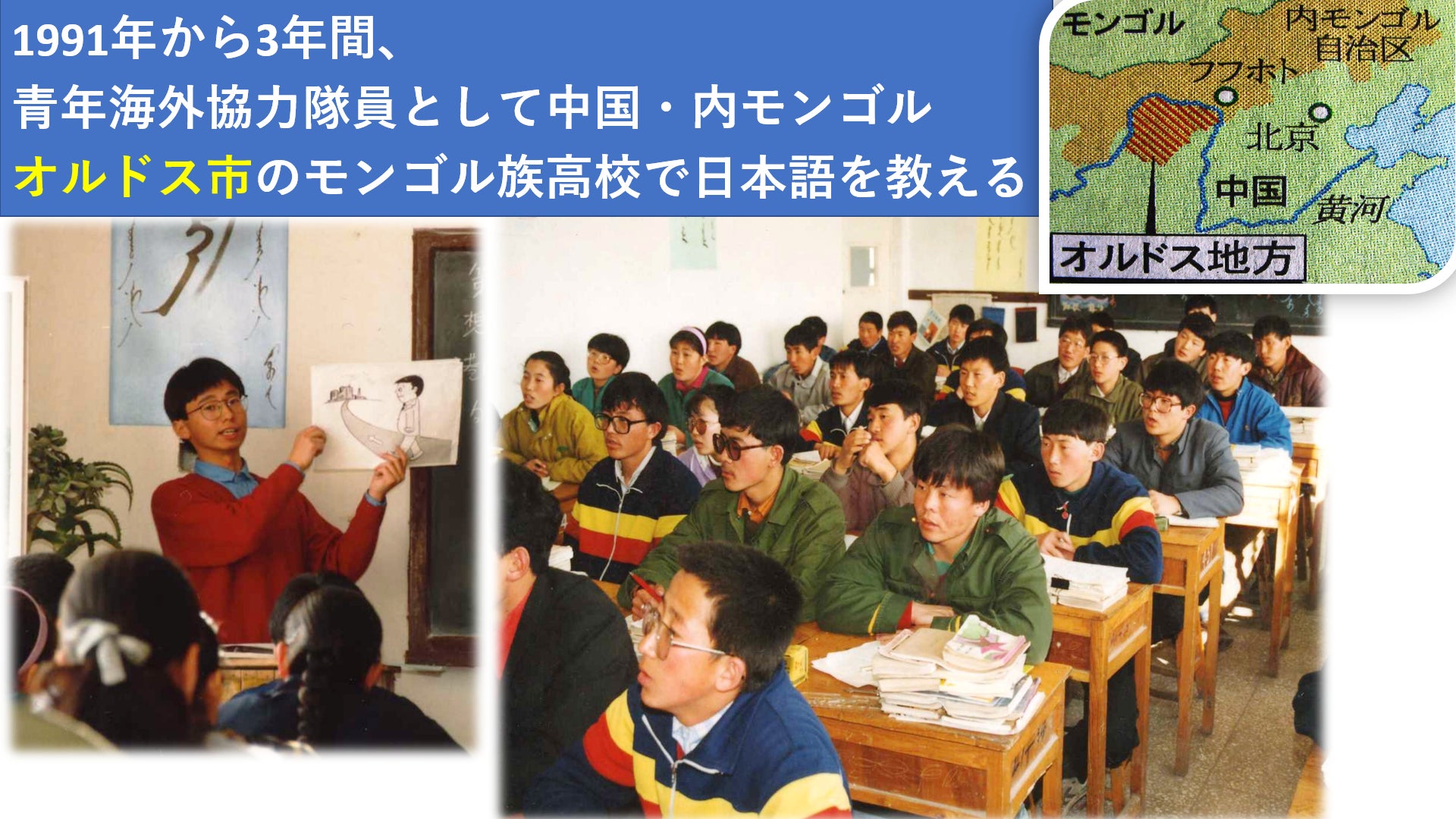 始まりは1991年、僕は青年海外協力隊員として、中国・内モンゴル・オルドスの、モンゴル族高校で日本語を教えました。日本が大好きな素朴な生徒たちに囲まれて、楽しく活動していました。