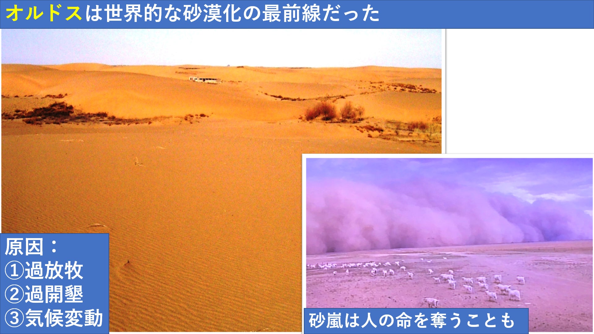 しかし行ってみるとそこは一面の砂漠でした。オルドスは砂漠化の最前線だったのです。僕自身砂嵐で死にそうになったこともあります。