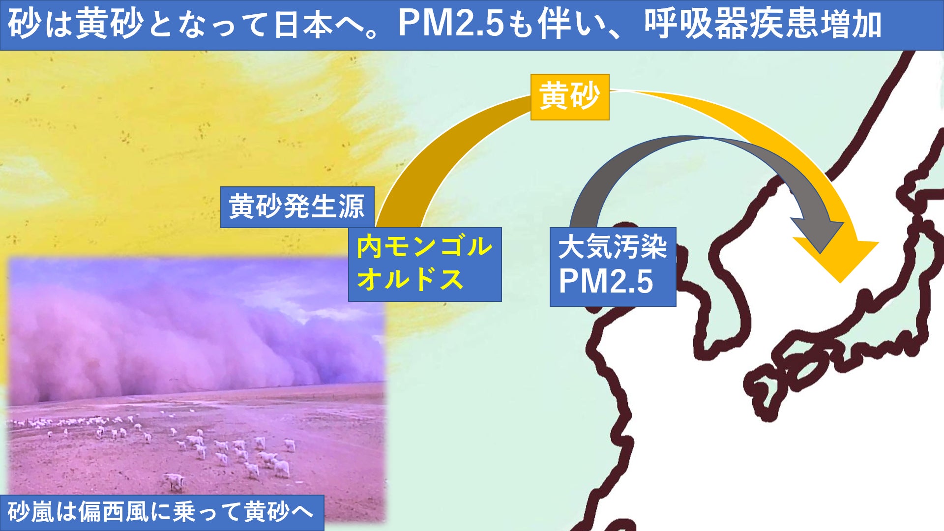 そして舞い上がった砂塵は黄砂となって日本へ。途中PM2.5も伴い、呼吸器疾患などが増えています。