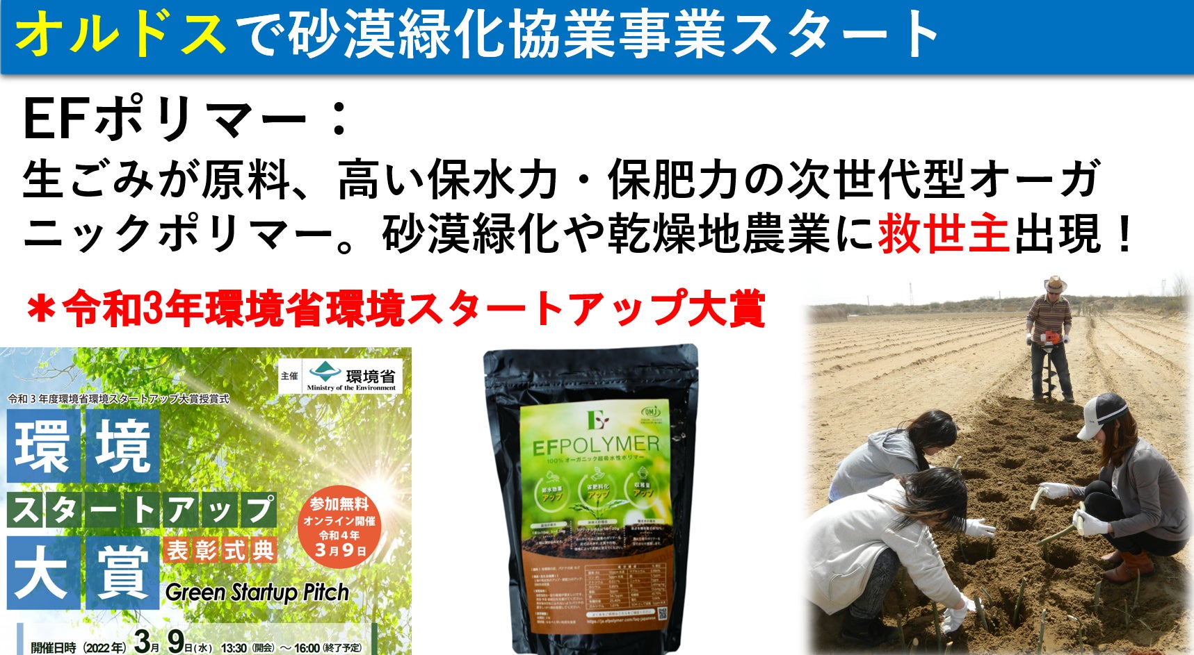 具体的には砂漠化の原因の一つでもある過放牧(羊や山羊の増やしすぎ)を減らし、有機農業や漢方など高付加価作物の生産など新しい事業に取り組んでいます。長年の努力の結果ようやく今年提携先の村に日本の技術を使った有機肥料工場が完成しました。そして去年から環境にやさしい最先端の保水材「EFポリマー」の実証実験がスタートしました。今後、作物の選定や栽培方法の確立、高付加価値農作物の市場開拓など従来の植林に比べて、はるかに資金やノウハウが必要となってきます。