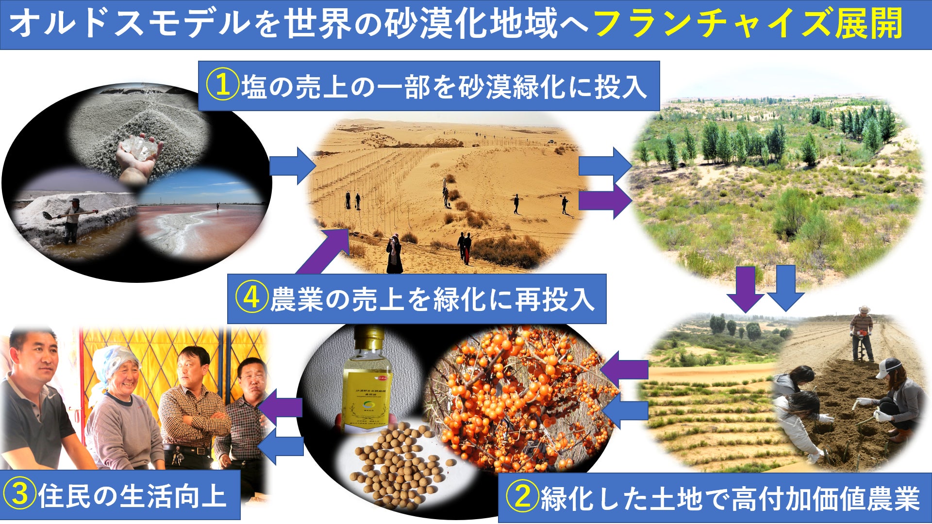オルドスモデルが完成すれば、これら地域の砂漠に眠っている塩を採掘し、世界中で販売、売上の一部を砂漠緑化に投入。緑化した土地で高付加価値農業を実践。オルドスモデルを世界の砂漠化に苦しむ地域へフランチャイズ展開していきます。