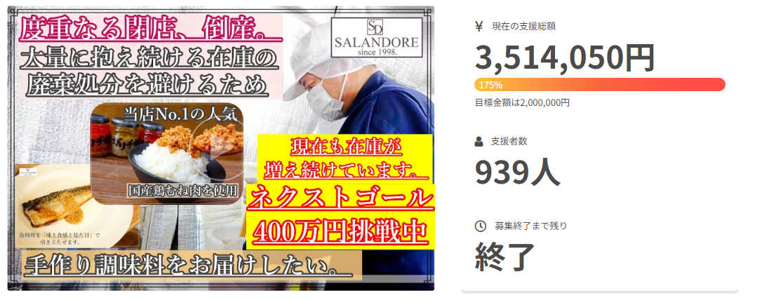 2023/12/17 11:40お世話になっております。福岡県の食品メーカー「サランドレ」の永田です。過去にご支援いただきまして本当にありがとうございました。ご支援いただいたことで今まで事業を続けてこれたこと、改めて心より感謝申し上げます。今回は、代表者の変更と新たなプロジェクトについての活動報告となります。●新たなプロジェクト【被災から復旧させ、父から思いを引き継ぎ、愛される味を存続させたい。】https://camp-fire.jp/projects/view/726445今年の7月に九州を襲った九州北部豪雨。福岡県内でも死者が出るなど、甚大な被害をもたらしました。この際に、材料や資材の保管庫である工場兼倉庫が浸水したことにより、保管していた材料及び資材の全ての処分を余儀なくされました。また、工場自体の床や壁の損害も深刻で、稼働し続けていくことが難しくなり、工場自体の稼働停止にまで追い込まれました。様々な負担が増大した結果、これまで事業を続けてきていた私の父が倒れてしまい、サランドレは完全に事業停止することとなってしまいました。そこから、なんとか事業を再開したものの、現在も工場は稼働停止のままとなっています。また、父が続けてきたサランドレについても、息子である私が完全に引き継ぎ、これから全身全霊で続けていくことを決意し今に至ります。とても厳しい状況が続いており、私自身としても厳しいスタートですが、諦めず出来ることを最後までやっていこうと思います。ただ、現実はとても簡単な状況ではなく、まずは工場の復旧・再稼働をしなければそもそも続けていくこともできない状況です。そこで、被災から復旧して工場を再稼働するために新たなプロジェクトを開始しました。●新たなプロジェクト【被災から復旧させ、父から思いを引き継ぎ、愛される味を存続させたい。】https://camp-fire.jp/projects/view/726445どうか、プロジェクトのご支援やお気に入り登録、周りの方に広めていただくなど、可能な範囲で結構ですので、どうかよろしくお願いいたします。また、過去にコロナ禍でも父が皆様にご支援いただいていたことを知り、今回の被災でもご支援をお願いすることは、気持ちとしては憚られました。今まで応援していただいていた方に申し訳ないという気持ちがありますが、私自身、覚悟を持って進めていく必要があると思い、本プロジェクトを遂行するに至りました。至らぬ点もあるかもしれませんが、全身全霊進めてまいりますので、応援・ご支援のほどどうかよろしくお願いいたします。ご不明やご支援もがございましたら、何なりとお申し付けください。それでは、最後まで全力で頑張って参りますのでよろしくお願いいたします。※通知が必要ないと感じた方は、メール通知を「受け取らない」に設定していただけますと幸いです。 もっと見る残り3時間、少しでも廃棄処分も減らすために。そしてご支援のお礼。