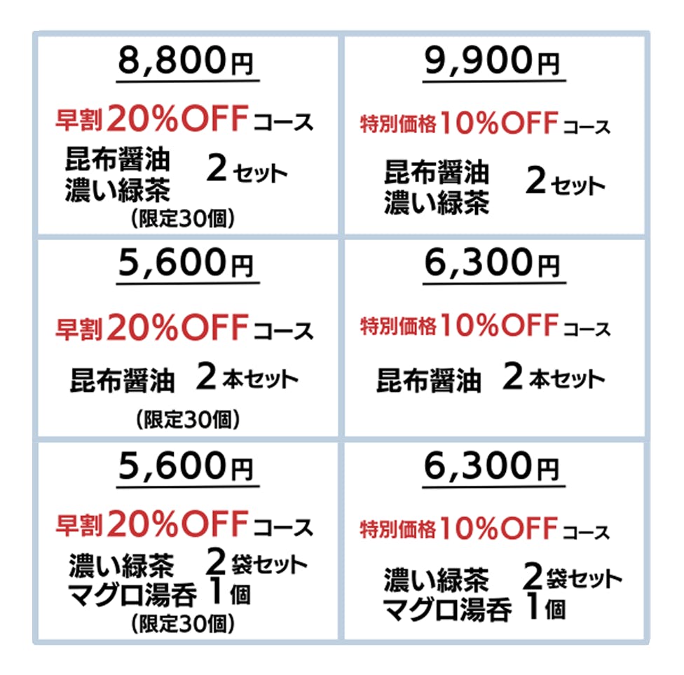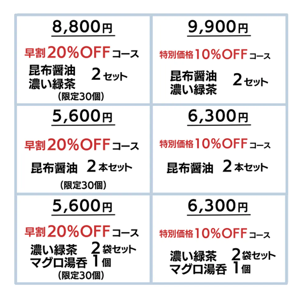 醤油、緑茶の個別でお求めでしたら長く使えるように「各2セット(早割20%)」がお得ですので、ご検討いただければと思います。