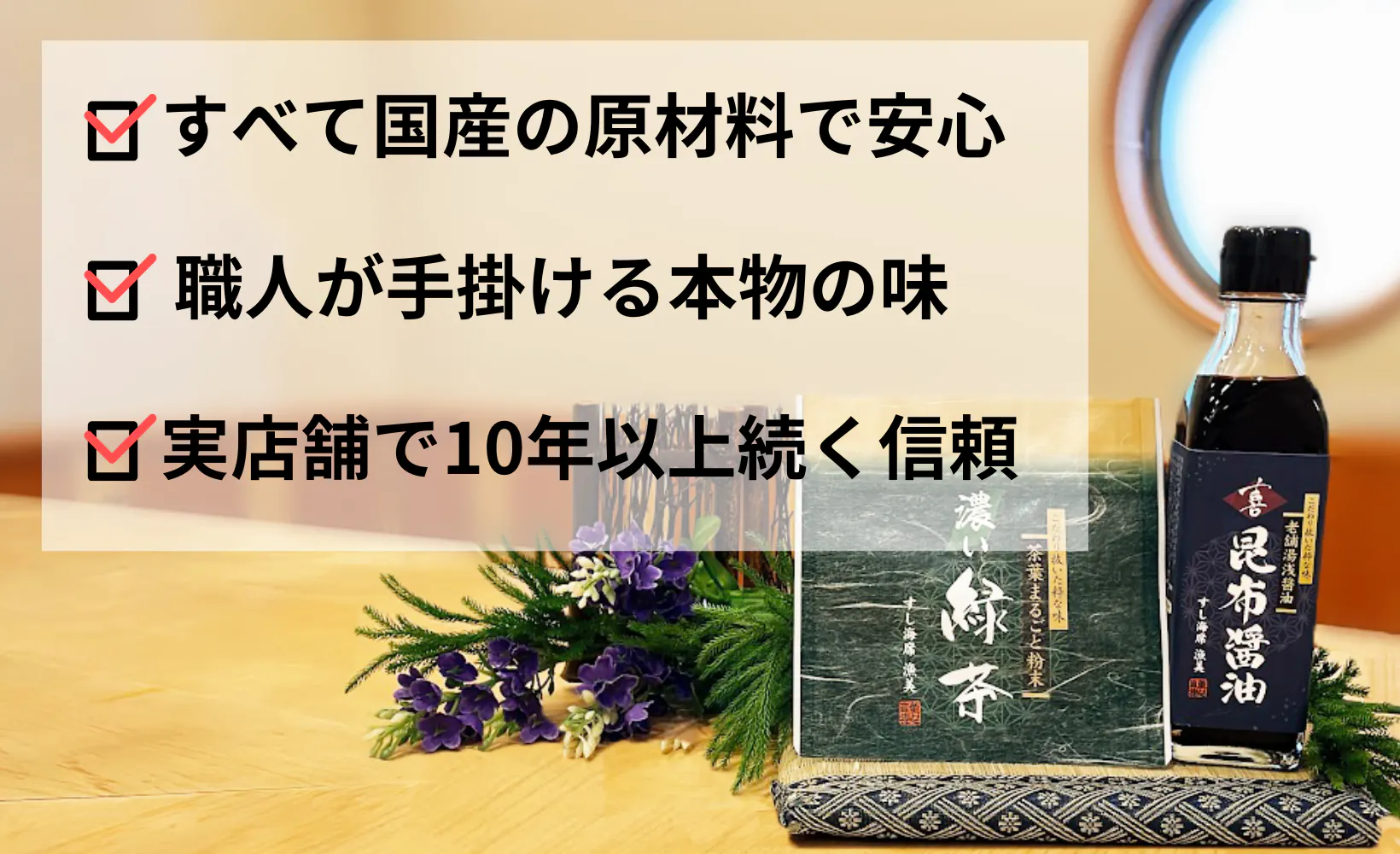 お寿司屋さんに来られるお客様は食に対してこだわっている方が多くいらっしゃいますので、醤油・緑茶ともに、皆さまが口にするものは、安心・安全なものを提供しています。