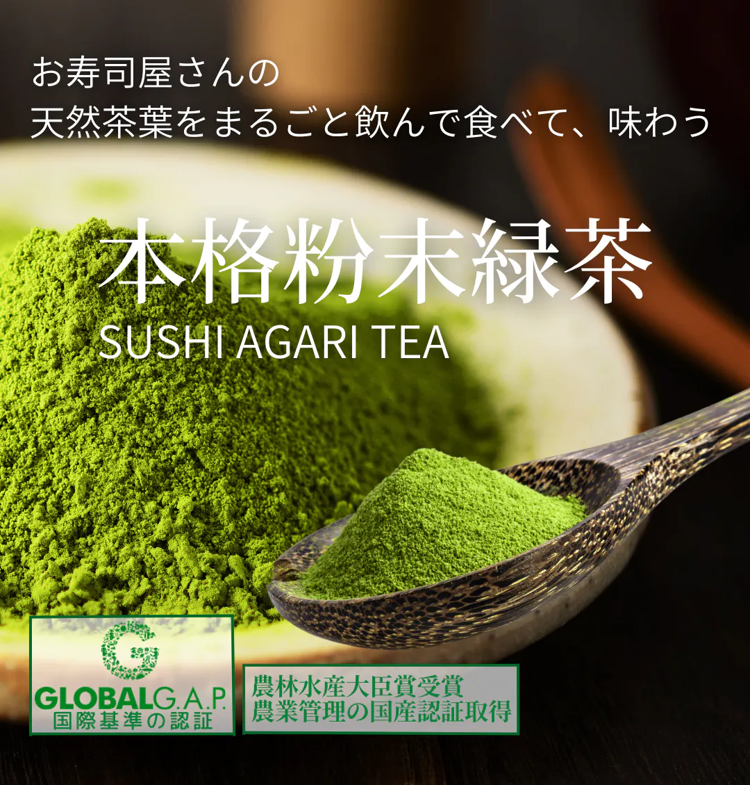お寿司・和食料理の美味しさを引き立てるため、旨みと程よい滋味を含み、 コクがあるのにさっぱりとした味わいです。 鮮やかな水色が映えるように、茶園に覆いをせず太陽の光をたっぷり浴びた新芽でつくった煎茶を、抹茶と同じ製造方法の石臼で挽き、粉末にしました。 お寿司や和食料理に合わせる上級な原料になっております。ぜひ、プレミアムな味わいをお楽しみください。