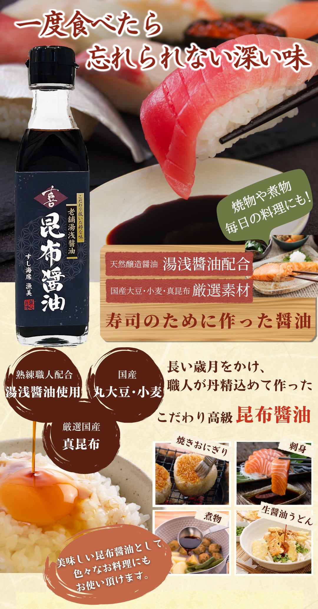 寿司のための高級昆布醤油です。とても美味しい醤油ですので、色々なお料理にお試しください。