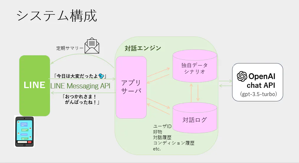 対話エンジン内ではユーザーからの入力を自然言語処理し、発言内容等に応じて決まったシナリオ通りに応答する場合と、OpenAI社のchat API(ChatGPT3.5-turbo)を呼んで応答を自動生成する場合とのハイブリッド実装を行い、これによって快適な対話を実現します。