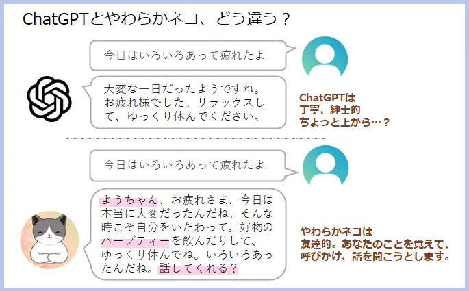 日々の思いや悩み事など、誰に話したらいいのかという話題、ありますよね…。人間ではないからこその気軽な話し相手が欲しくて、AI bot「やわらかネコ」を作り始めました。幅広い知見を学習済で何でも比較的そつなく返事してくれるChatGPTは素晴らしいけれど、日々の気軽な話し相手としてはつれない感じ…そこで、欲しい要素をもろもろ盛り込んで以下のような対話を叶える「やわらかネコ」の実装を進めています。