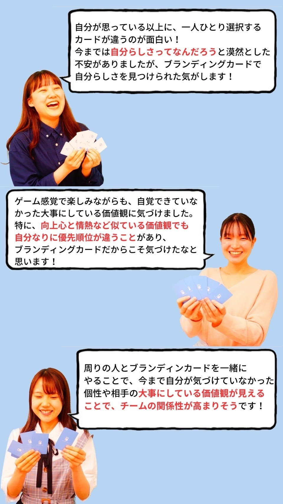 そこでNPO法人として設立1周年を迎えたこの度、若者たちがゲーム形式で自身の価値観を見つめ直し、かつ他者と伝え合う体験そのものを作ることで、自分だけの大切な価値観、さらにはその先にある自分ブランドを発見して行ってほしいという想いから、「ブランディングカード」の提供を開始いたします。