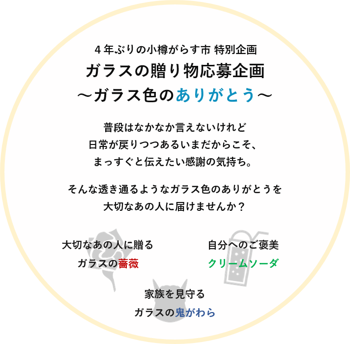 小樽がらす市は、単にガラスの魅力をたくさんの人に知ってもらうだけのイベントではありません。小樽がらす市をきっかけに、コミュニケーションが生まれたり、日常生活が豊かになったりと、それぞれの暮らしや生き方に彩りを届けられるようなイベントでありたいと思っています。
