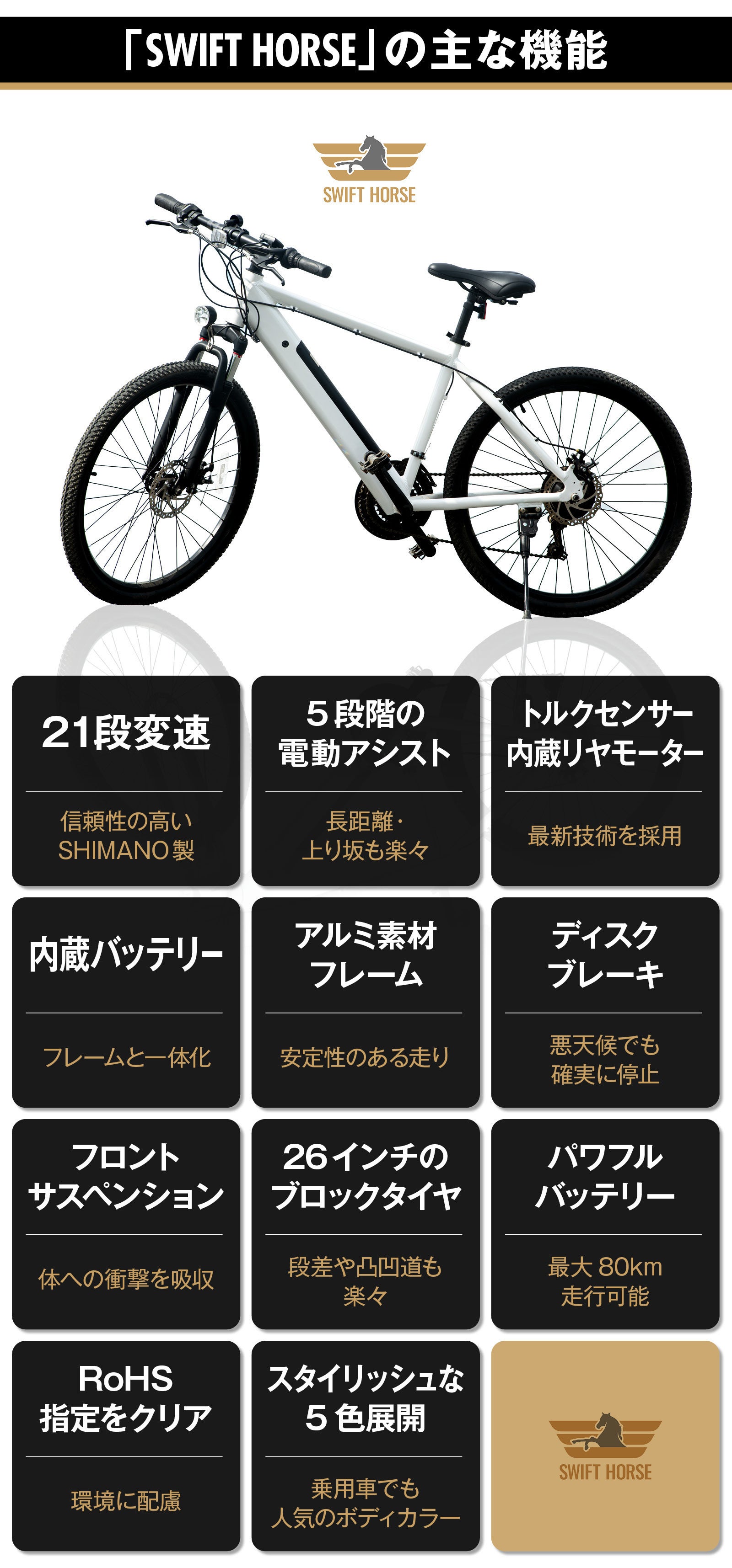 高い走行性能を持つ高機能マウンテンバイクに、電動アシスト機能を融合!5段階アシスト×21段変速のパワフルマシン、「SWIFT HORSE」がついに登場です。