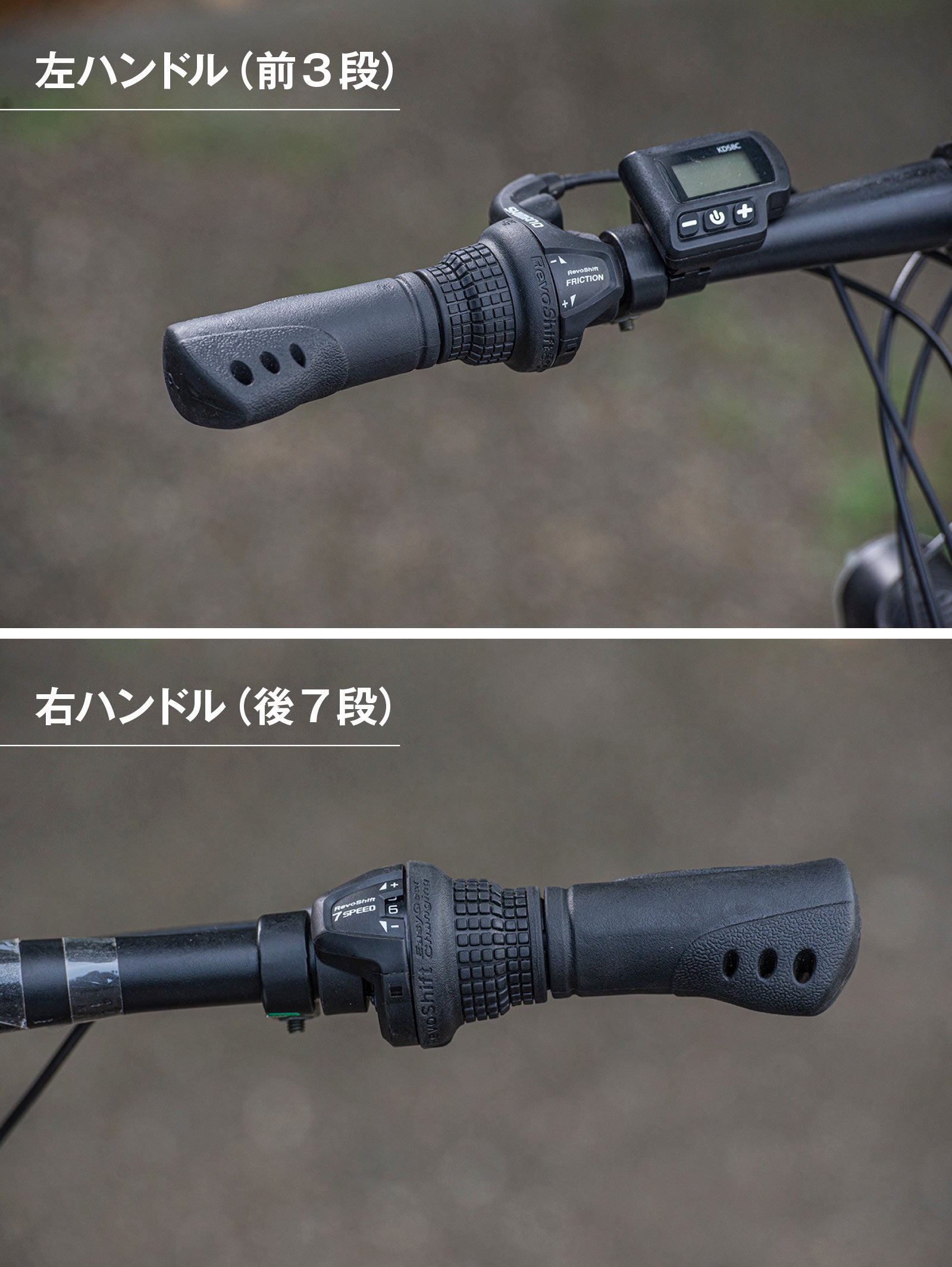 前3段の切り替えは左側、後7段は右側にレボシフトシフターを装備し、ハンドルから手を放すことなく簡単・確実にシフトチェンジ可能。