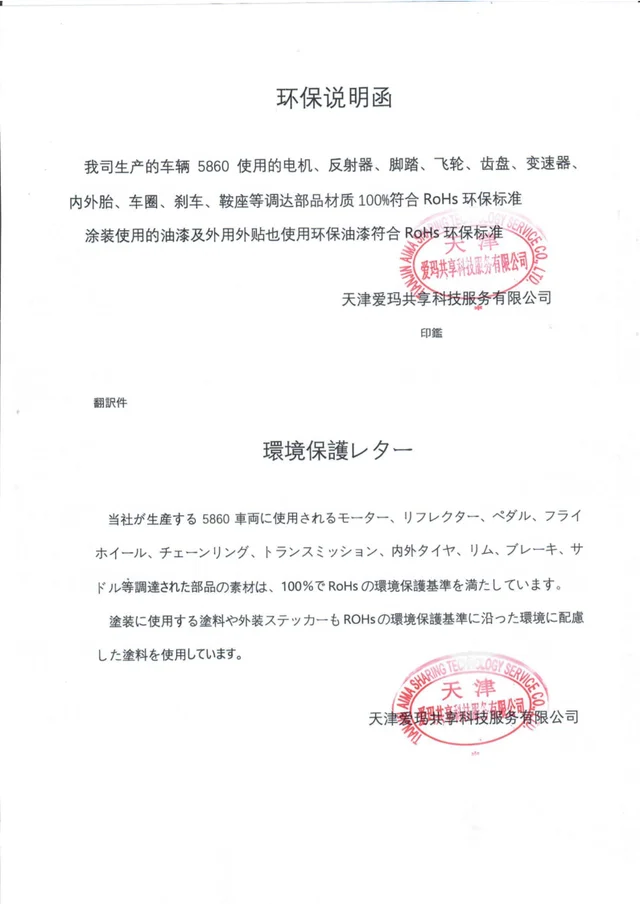 自転車の部品は、EUの環境保護基準「RoHS」を100%満たした部材を使用。環境に配慮した、ECOな自転車です。