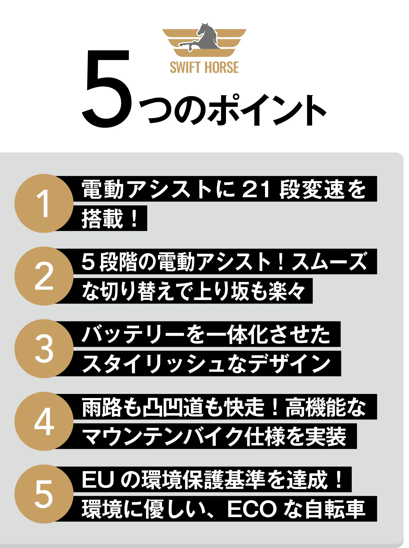 高い走行性能を持つ高機能マウンテンバイクに、電動アシスト機能を融合!5段階アシスト×21段変速のパワフルマシン、「SWIFT HORSE」がついに登場です。