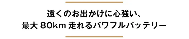 一度のフル充電で最大80kmの走行が可能。遠くのお出かけにも心強い、パワフルなバッテリーです。