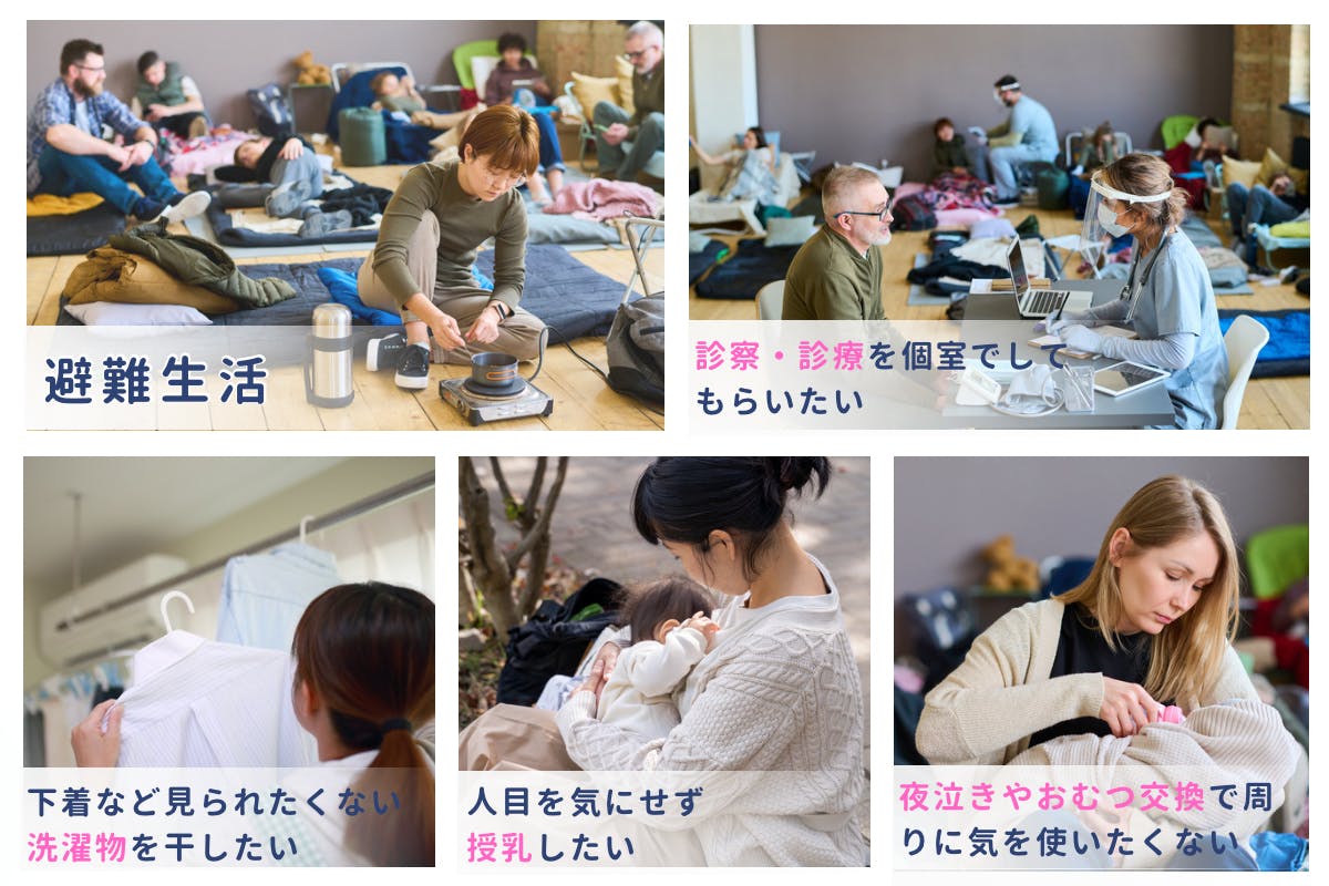 ・避難生活→洗濯物・着替え・診療・授乳・子育て・おむつ替え等プライベート空間が確保できます。通常時は備品庫として
