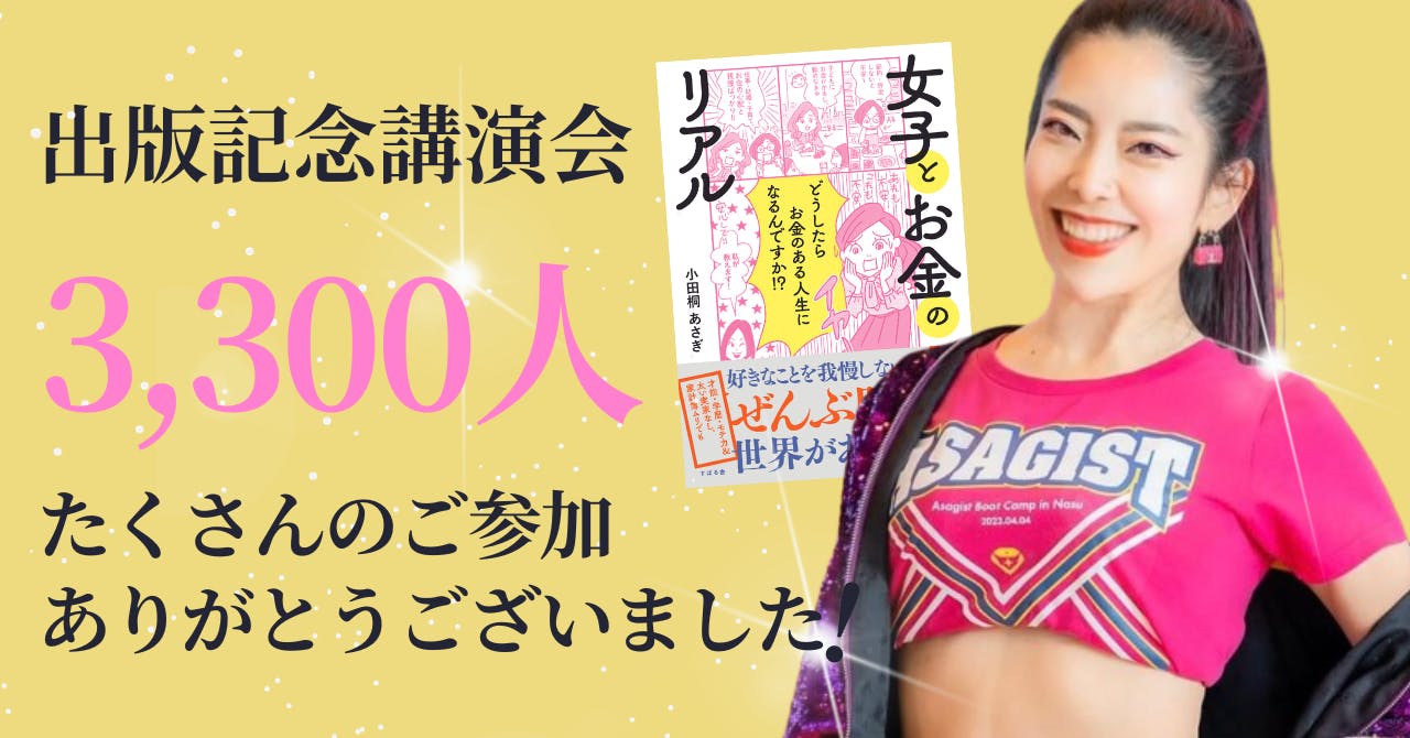 2023/12/04 18:00みなさま、こんばんは! 小田桐あさぎです。新刊『女子とお金のリアル』出版を記念して開催した、 全国7大都市(東京、京都、札幌、大阪、仙台、名古屋、福岡)の講演会も無事に終了することができました。お越しいただきました皆様本当にありがとうございます。 7月3日にクラファンをスタートさせてから約5か月。 間違いなく人生で一番、たくさんのチャレンジをした5か月でした。 クラウドファンディングは、支援総額1億2千5百万円! 新刊『女子とお金のリアル』は、発行部数10万部を突破! 全国7大都市のリアル講演会の来場者数は、3,300人超え! これが達成できたのも、 クラファンでご支援、そして応援してくれた皆様のおかげです。私が起業をしたきっかけは、一人目の子を妊娠したこと。 そこから8年「女性が楽しく仕事と育児を両立できる社会」の実現を目指し活動してきましたが、三冊目の書籍『女子とお金のリアル』を通じ、この思いをよりたくさんの日本女性に届けることができたと思っています。 これからも、「女性が楽しく仕事と育児を両立できる社会」 の実現に向けて活動を続けて参りますので、引き続き応援いただけると嬉しいです。小田桐あさぎ もっと見る