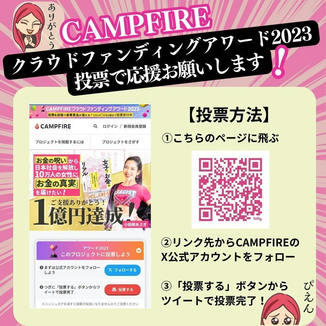 2024/01/01 09:00新年あけましておめでとうございます。本年もどうぞよろしくお願いします!みなさんに嬉しいお知らせとお願いです!7月に実施した『女子カネ出版記念クラファン』が、CAMPFIREクラウドファンディングアワード2023にノミネートされました!なんと10,000件以上のクラファンから、 100プロジェクト10カテゴリーに分けて表彰され、 女子カネ受賞カテゴリーは 【想いとお金がめぐった】プロジェクトになります。 ご支援くださったみなさまのおかげです。本当にありがとうございました!!!ここで皆様にご協力のお願いです。100プロジェクトの中から今年の総合プロジェクト1位が決まります。ぜひこの投票に参加して投票をお願いします。投票期間は1/4まで女子カネ集大成を、クラウドファンディングアワード2023 総合1位で飾りたい!!ぜひ、よろしくお願いします。【投票はこちらから】https://camp-fire.jp/projects/view/678540【アワード特設ページ】https://camp-fire.jp/award小田桐あさぎ もっと見る